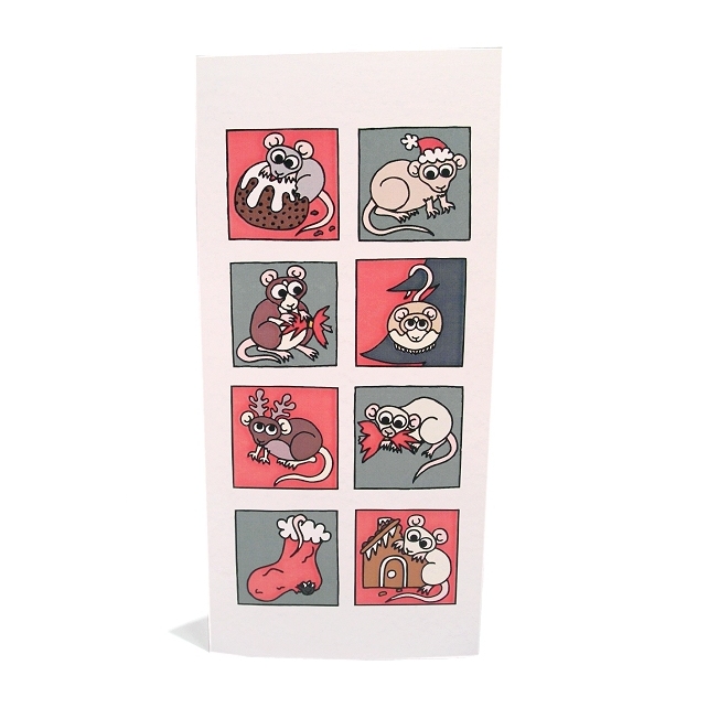 8 boxes with red and green backgrounds each featuring a cute fancy rat in various Christmassy scenes - a fat rat eating a Christmas pudding, a rat in a santa hat, 2 rats with a pulled cracker, a rat bauble, a rat in reindeer antlers, a rat in a Christmas stocking and a rat nibbling on a gingerbread house.