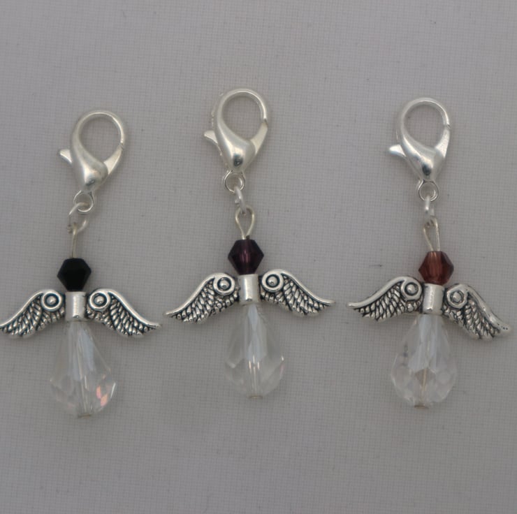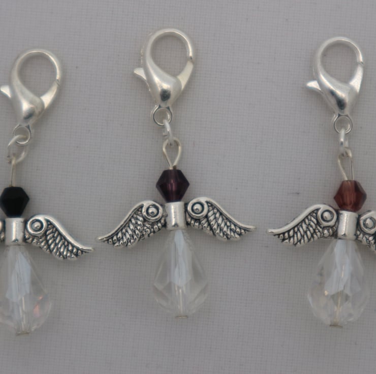 A set of 3 handmade crochet stitch markers in an angel design. These are great to keep track of your stitch numbers and rows when crocheting, they just clip on the relevant stitch. They are also very pretty and will brighten up your crochet projects.