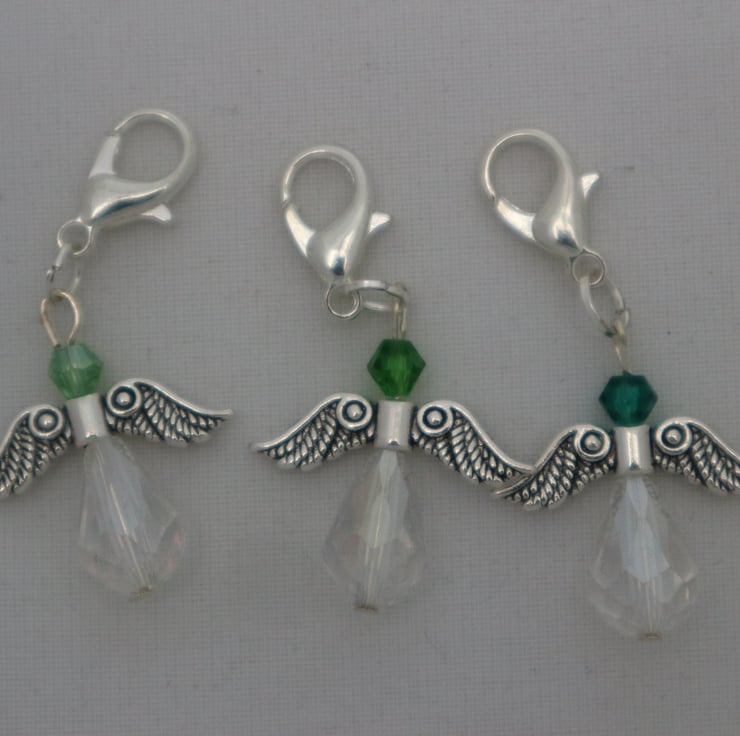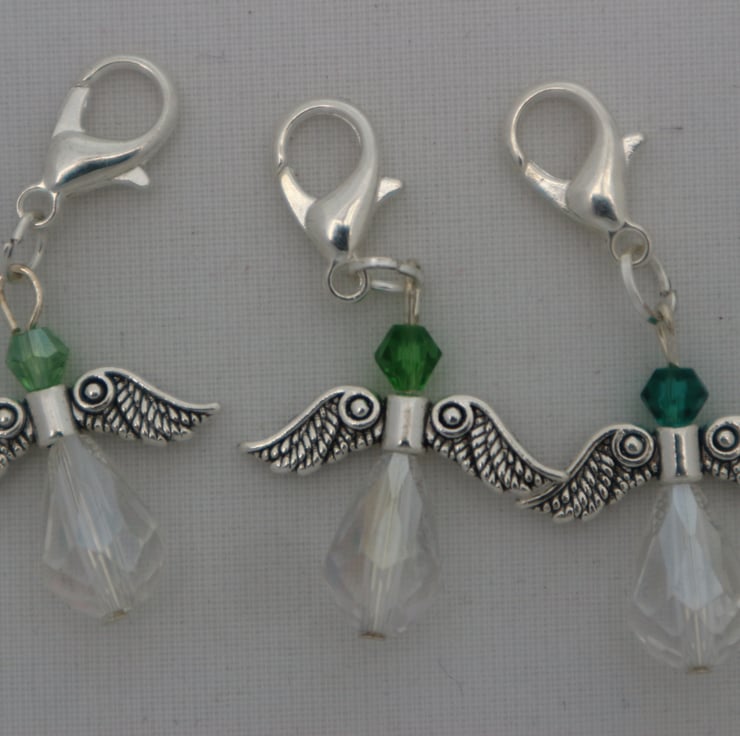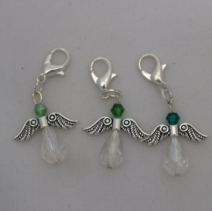 A set of 3 handmade crochet stitch markers in an angel design. These are great to keep track of your stitch numbers and rows when crocheting, they just clip on the relevant stitch. They are also very pretty and will brighten up your crochet projects.