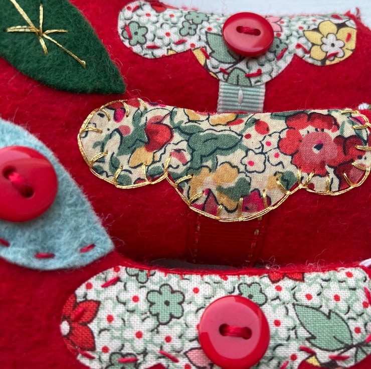 It has been lovingly hand sewn from red felt with a pale green ribbon, decorative red embroidery, appliquéd with pale green felt and red, green, pink and yellow floral cotton and finished with red buttons.