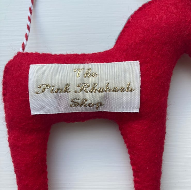 It has been lightly stuffed and finished with a red and white hanging string and The Pink Rhubarb Shop label on the reverse.