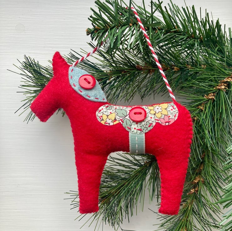 The hand painted and carved wooden Swedish dala horses evoke an image in my mind of a more traditional time when the pace of life was slower. I wanted to capture this feeling and timeless folk design in a felt Christmas decoration that I hope will become part of your Christmas tradition and be enjoyed for many years to come.