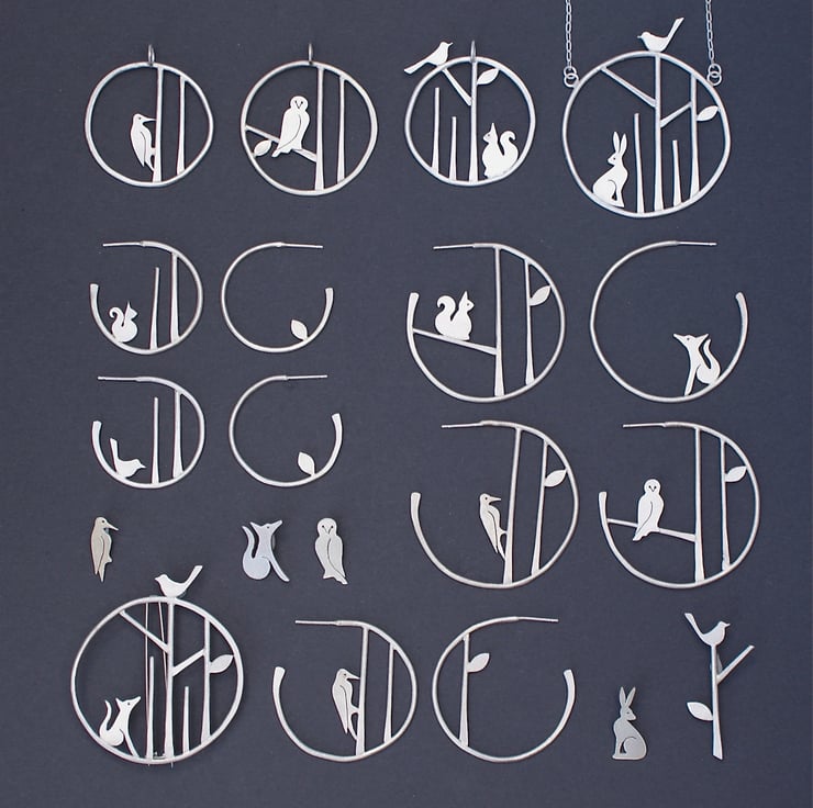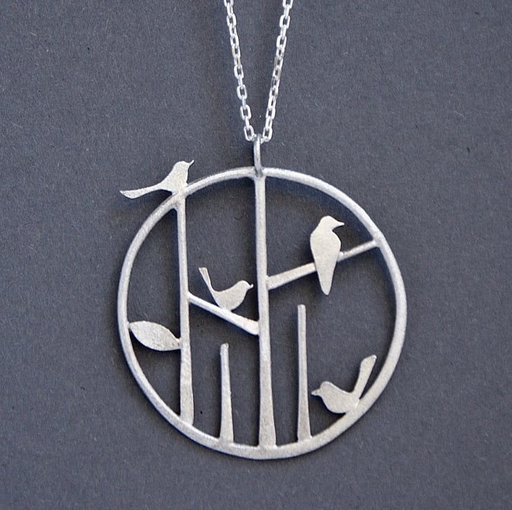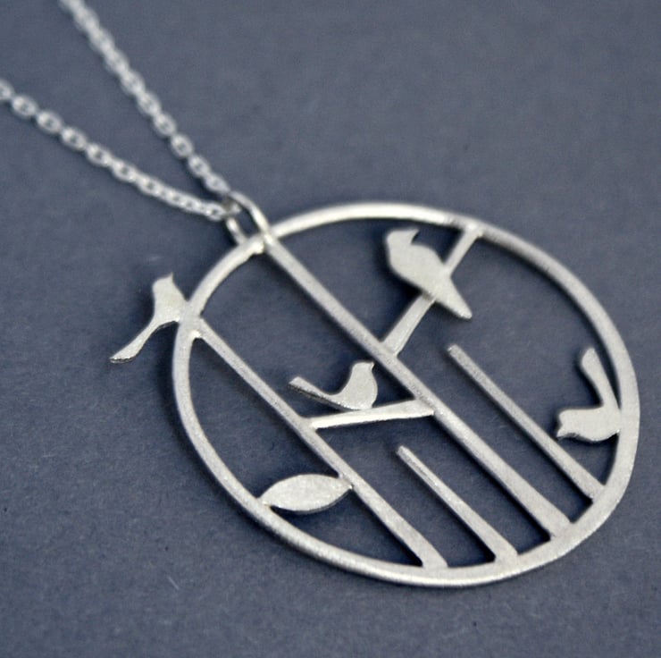 A lovely necklace featuring a little line of stylized trees with 4 bird perched on different branches. Soldered within a hand forged irregular circle for an organic feel and hung from an 18 inch sterling silver chain. The finish is a lovely frosted texture which has a subtle sparkle and is slightly rough to the touch.