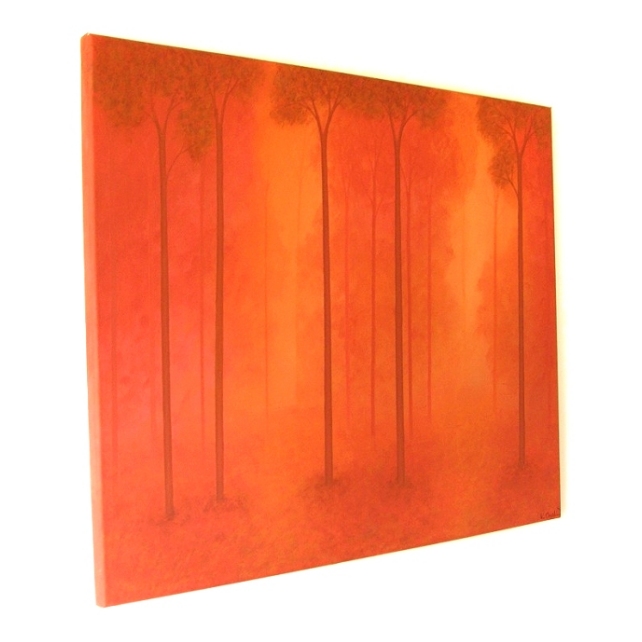 An original acrylic painting of a woodland scene during the orange glow of a misty autumn morning.