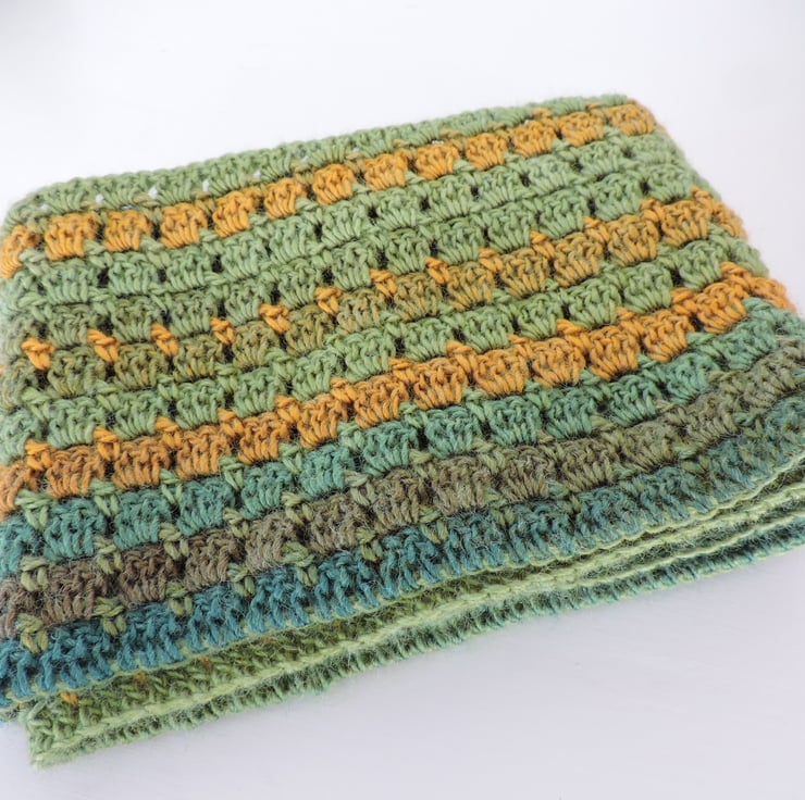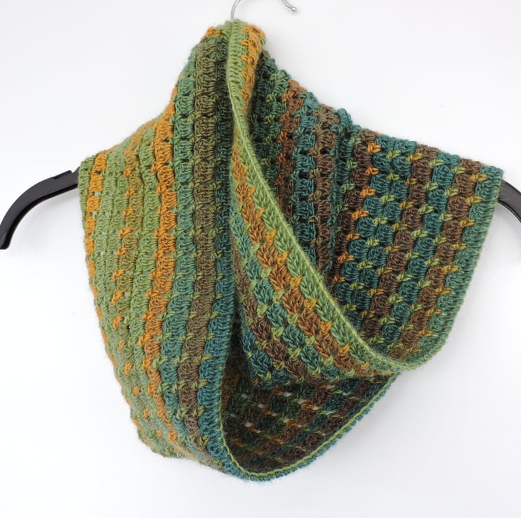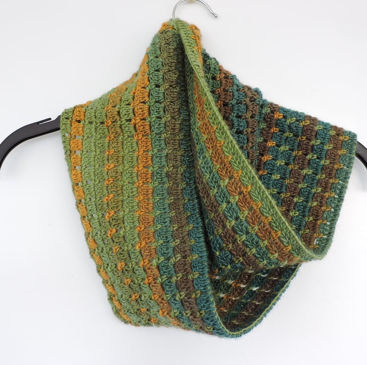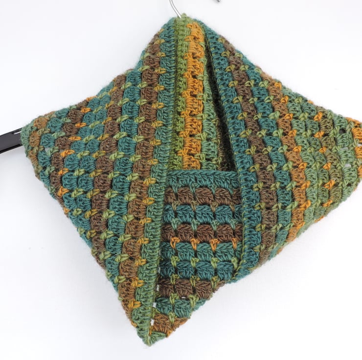I've crocheted this warm and cosy infinity scarf in an acrylic and wool yarn blend. A multi tonal yarn of greens and gold.