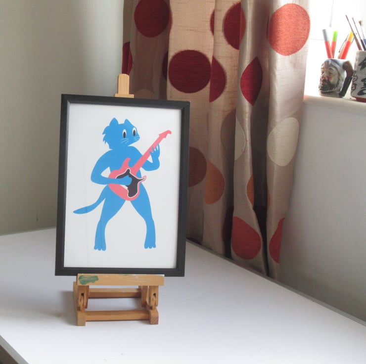 Graphic image of a cat-human playing the guitar, Dark blue background and light blue cat with a white guitar.