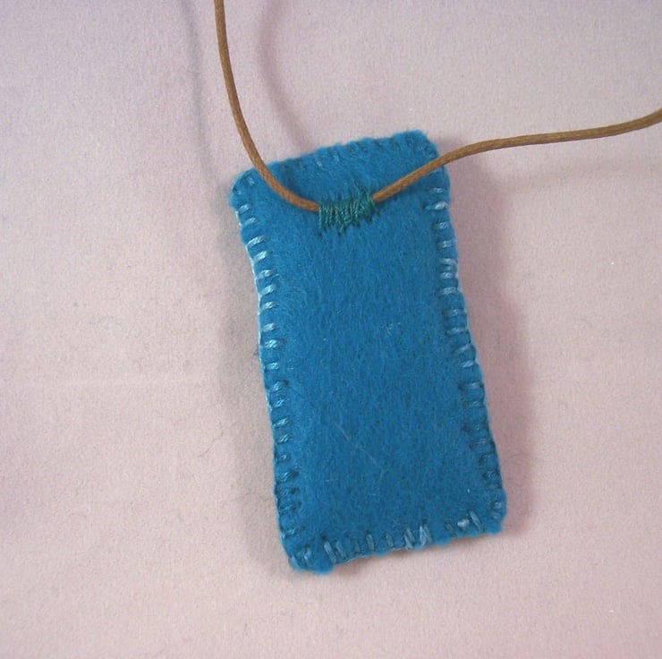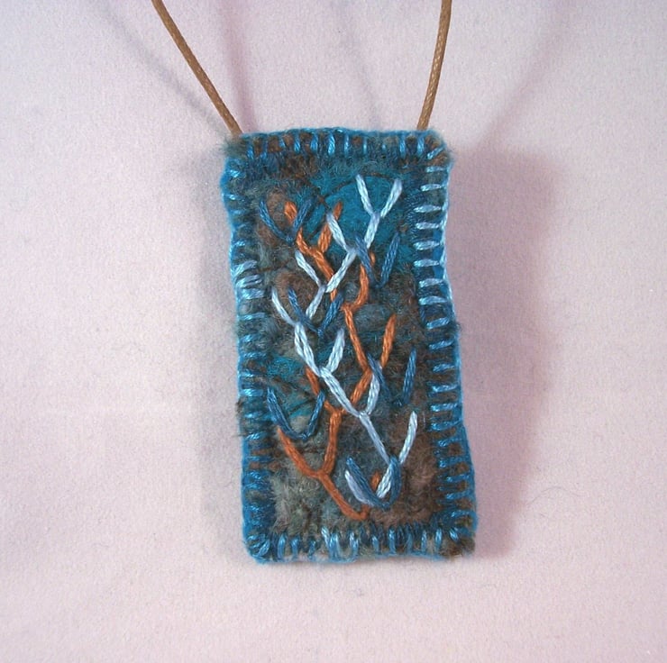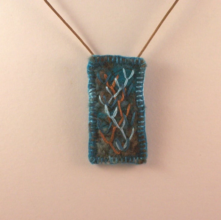 Needle felted and hand embroidered necklace, backed with wool felt. Stitched onto light brown waxed cotton cord with slip knot fastening.