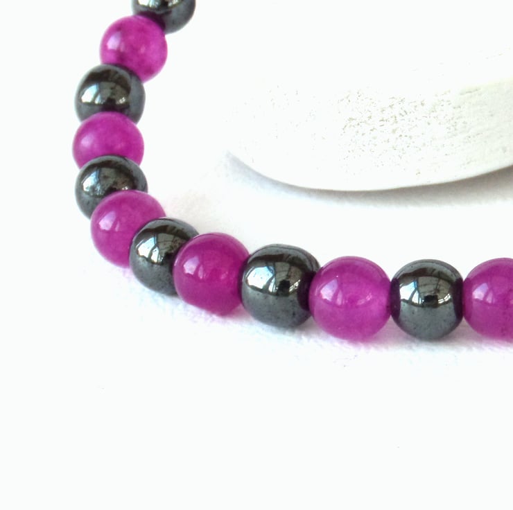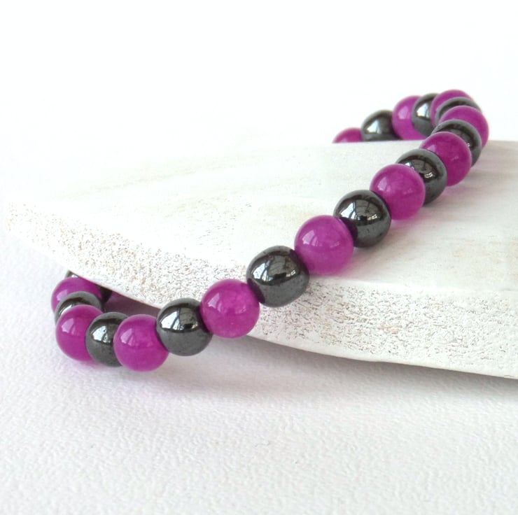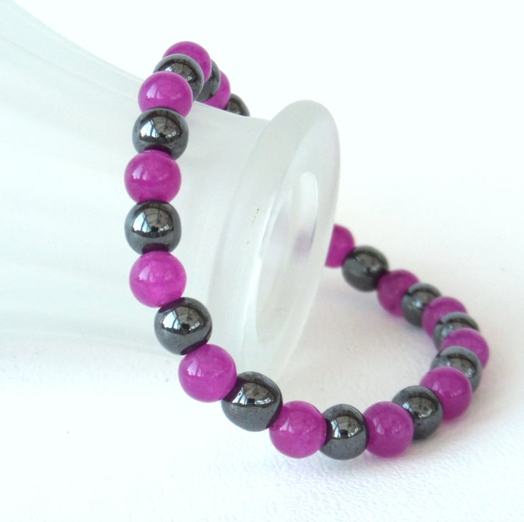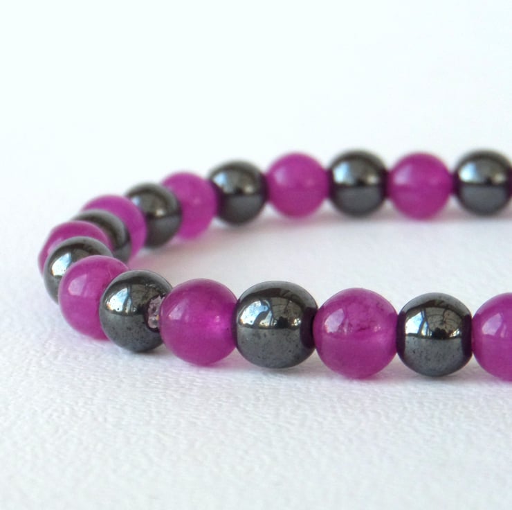 Jade dyed in a beautiful crimson shade contracts with polished hematite in this lovely stretchy bracelet.