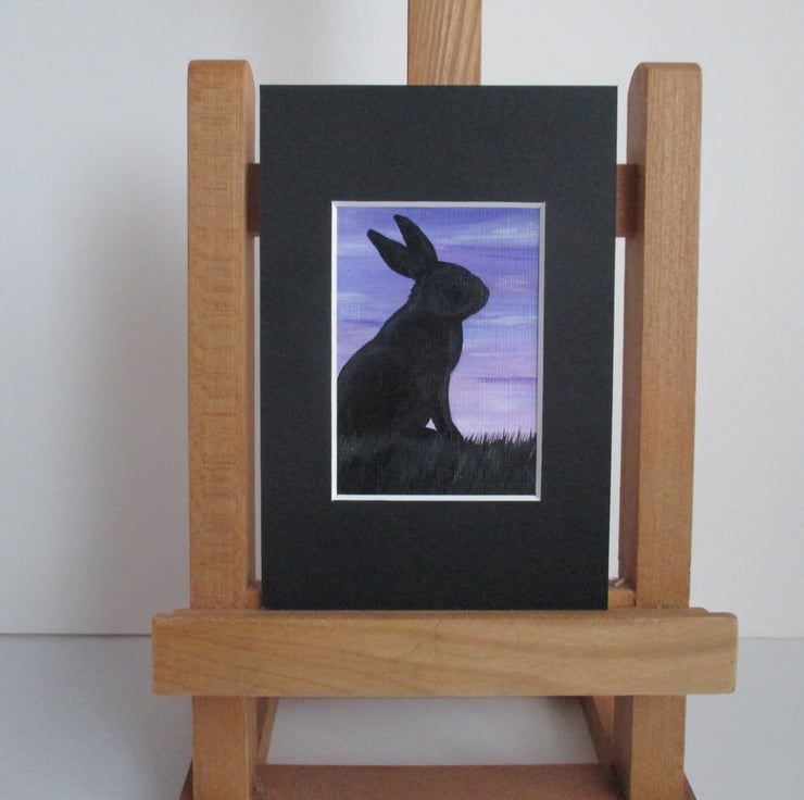 This is an original painting of a bunny rabbit silhouetted against a sky in shades of purple and lilac. It is mounted in a black 6 x 4 inch mount, which will fit into a standard sized frame.