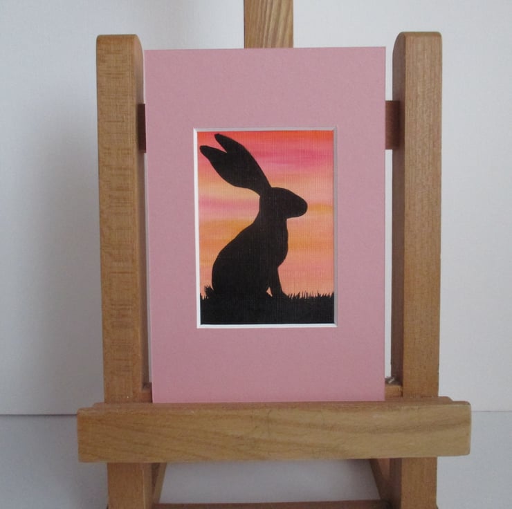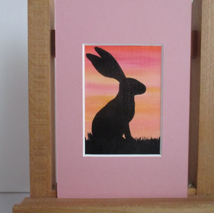 This is an original painting of a bunny rabbit silhouetted against a sky in shades of pink and yellow. It is mounted in a dusky pink 6 x 4 inch mount, which will fit into a standard sized frame.
