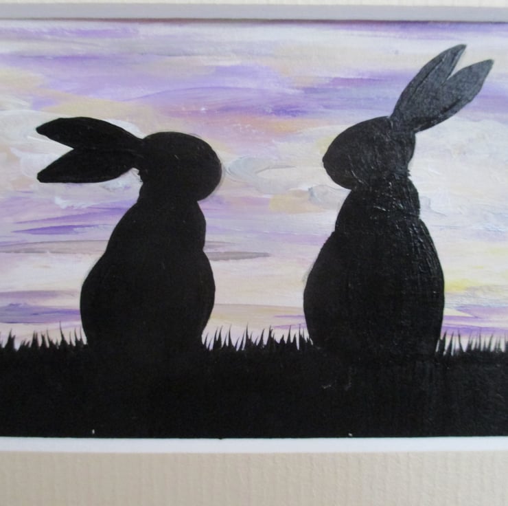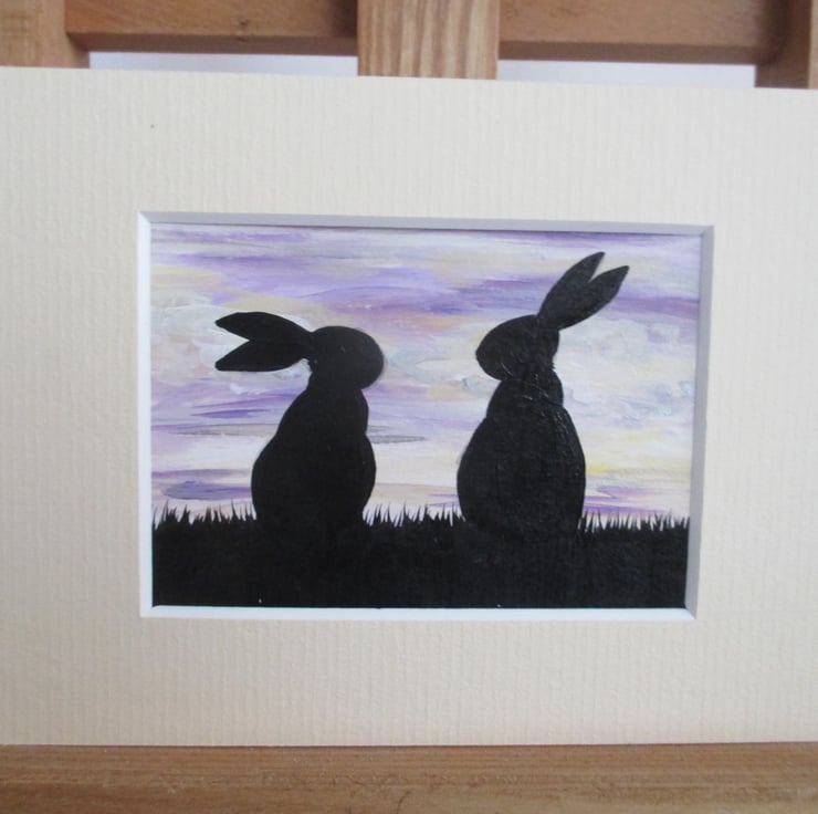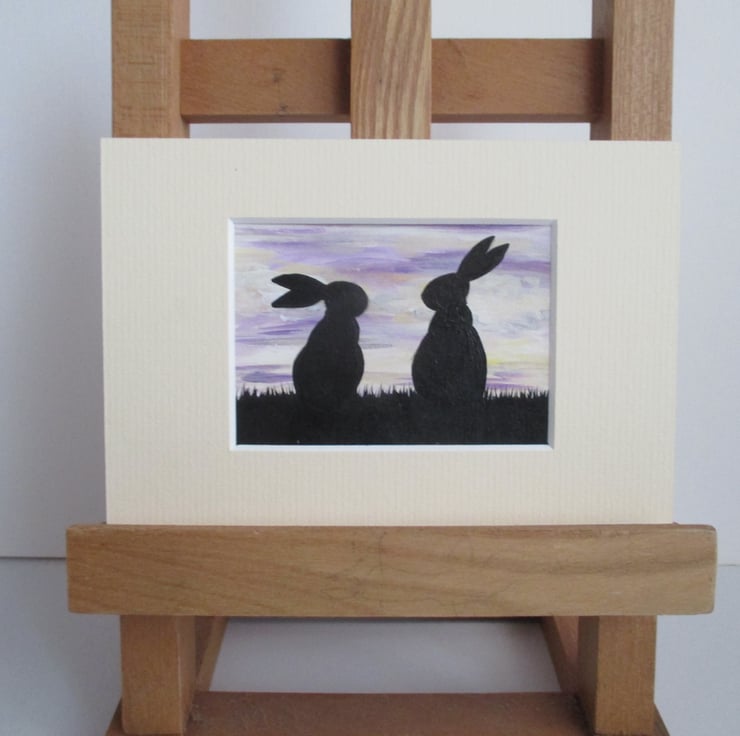 This is an original painting of two bunny rabbits silhouetted against a sky in shades of purple and lilac. It is mounted in a white 6 x 4 inch mount, which will fit into a standard sized frame.