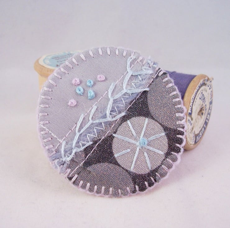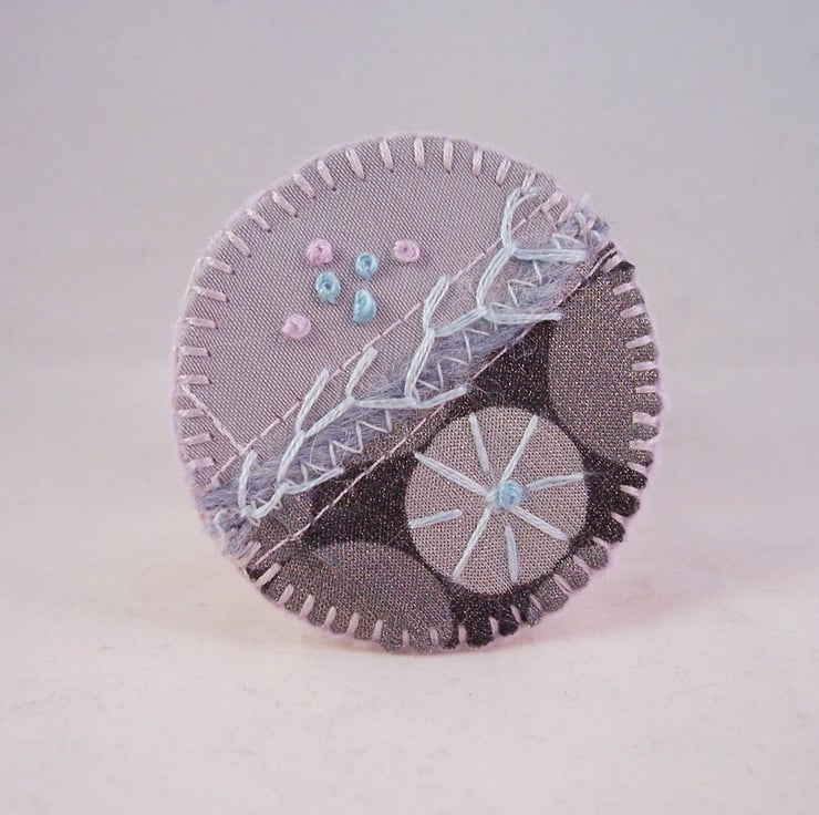 Textile brooch in soft shades of grey, silver and duck egg blue, with hints of mauve.