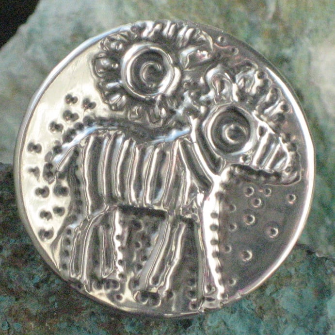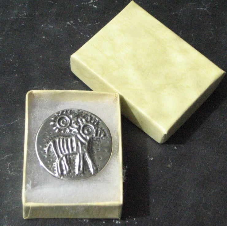 Zebra brooch or badge handmade in modern lead-free pewter. Measuring 32mm in diameter, this little brooch has a 25mm pin with safety catch on the reverse. The zebra brooch comes gift boxed (may differ from that shown). A nice little gift for a woman for any occasion.