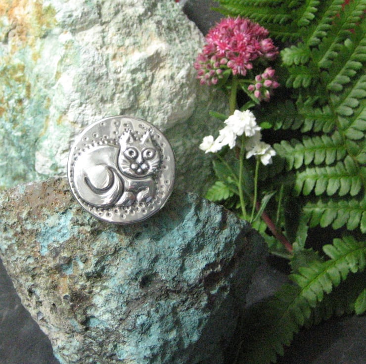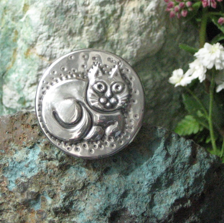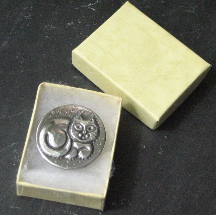 Cat brooch. This little cat brooch has been hand-crafted in shiny lead-free pewter. Measuring 32mm in diameter, it has a 25mm pin with safety catch on the reverse. Comes gift boxed ( may differ from that shown ). A perfect small gift for a woman for a 10th Wedding Anniversary or Birthday.