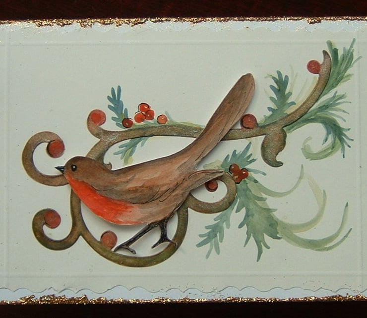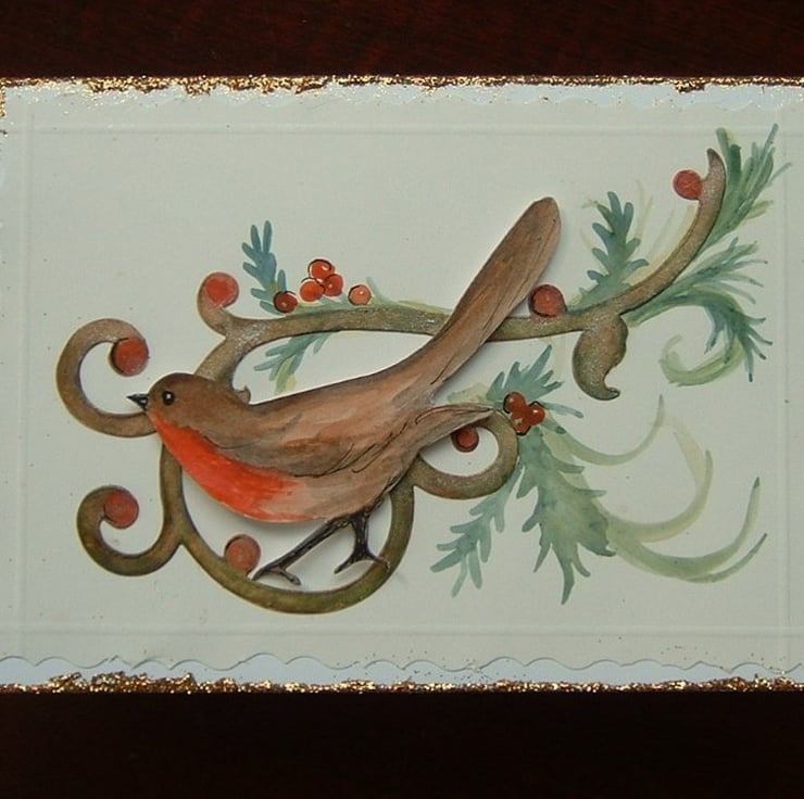I hand painted some foliage for the background (using watercolour paints) then I added a die cut swirl that I hand painted and glittered. Finally the robin was hand painted and added and everything was mounted onto quality white card stock.