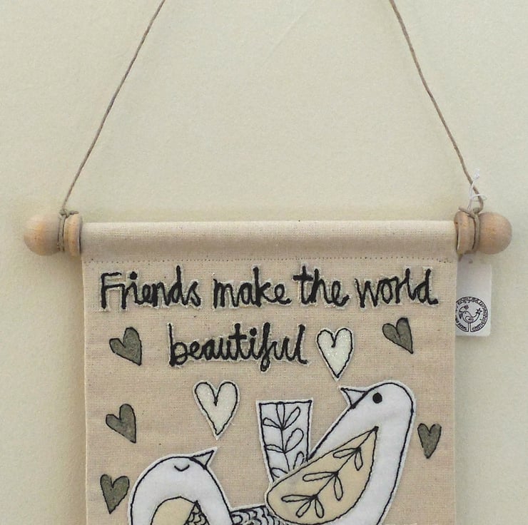 A fabric banner measuring approximately, 19 cm in length and 13 cm in width, is embroidered with birdies, hearts and words. Suspended on a wooden dowel, with wooden finials and a linen string to hang.