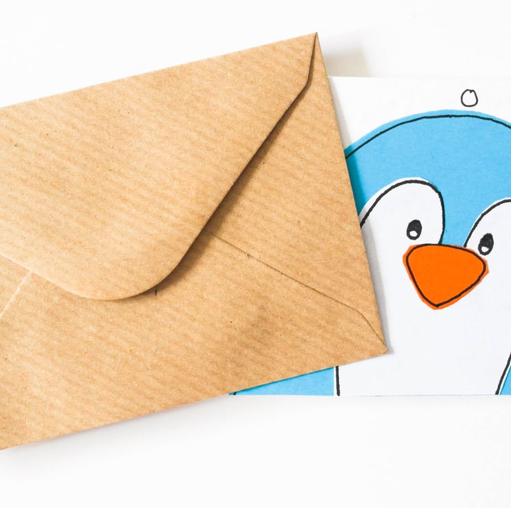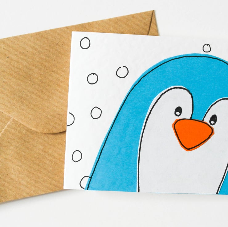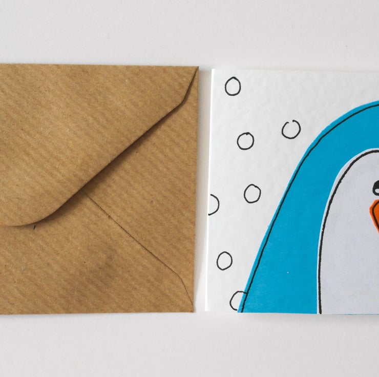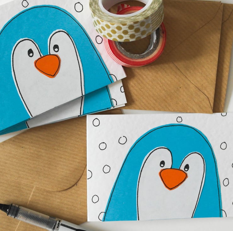 The card design is made by hand cutting each individual pieces out of various papers and finished by hand drawing the details of the penguin in ink, they are then individually attached piece by piece to the card giving it a textured and slightly 'raised' appearance.