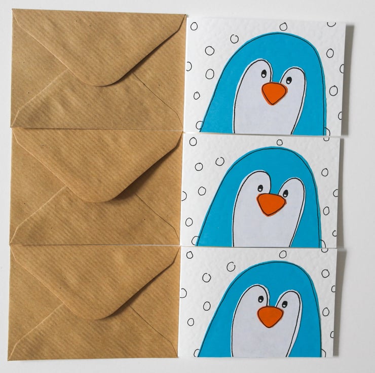 Cute handmade penguin pack of six Christmas cards. Perfect for sending seasons greetings to loved one's this Christmas. Pop in a stocking to be used after Christmas as cute Thank you notes. Ideal as lunch box mini notes. Brighten up your child's day or Christmas.