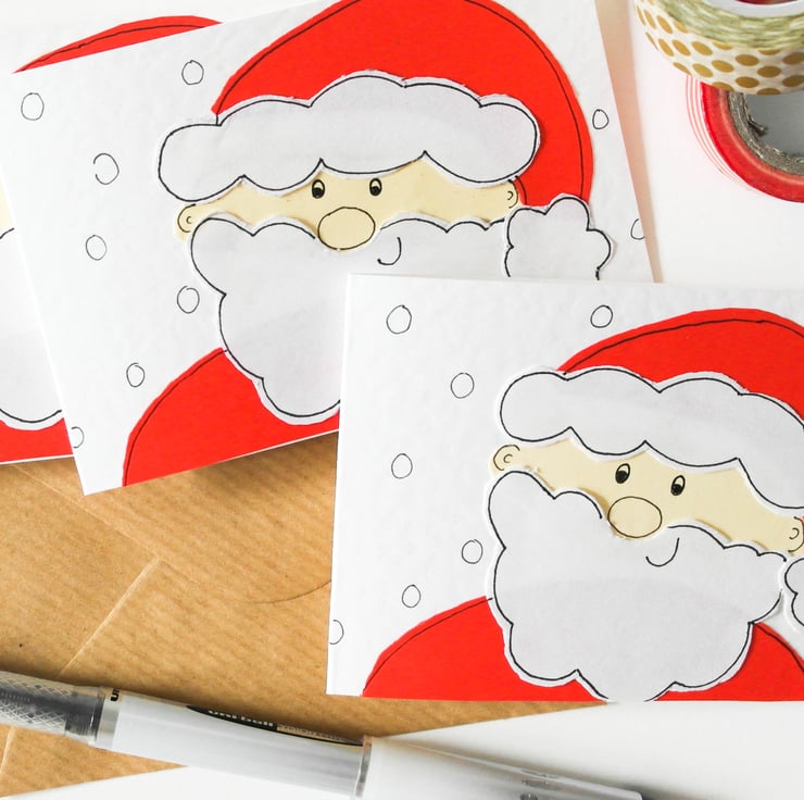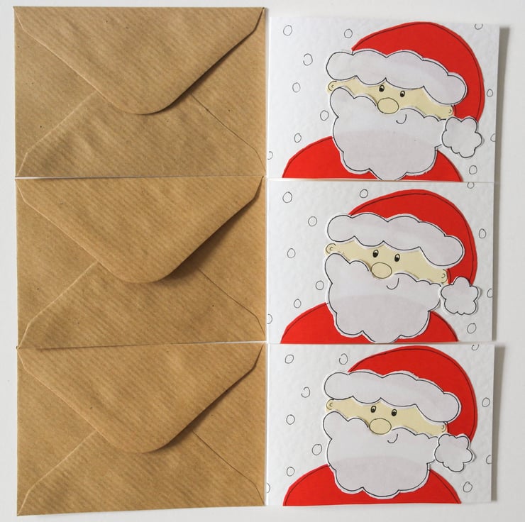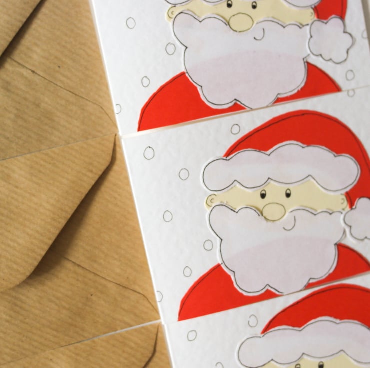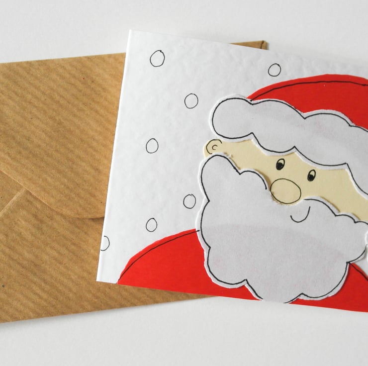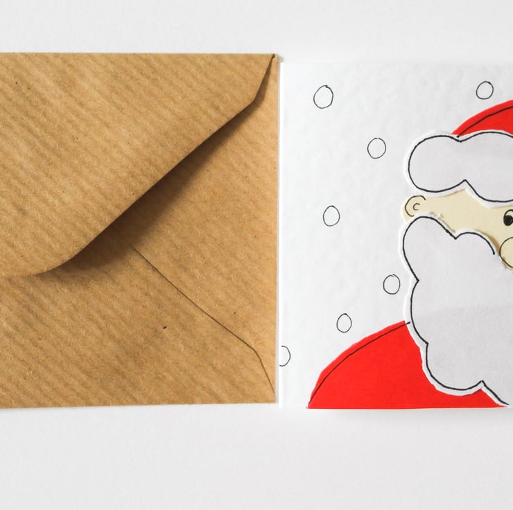 The card design is made by hand cutting each individual pieces out of various papers and finished by hand drawing the details of Father Christams in ink, they are then individually attached piece by piece to the card giving it a textured and slightly 'raised' appearance.