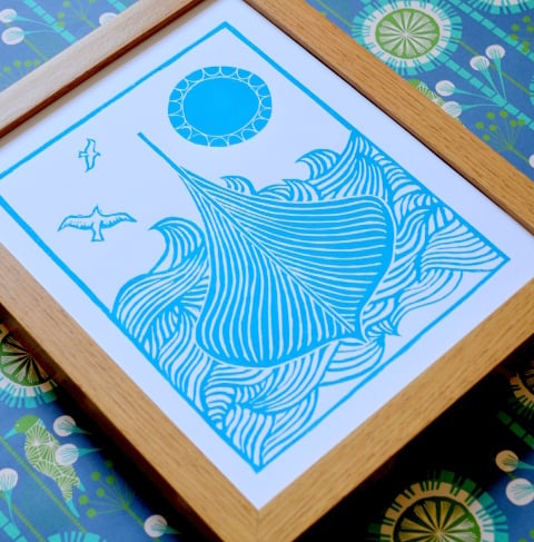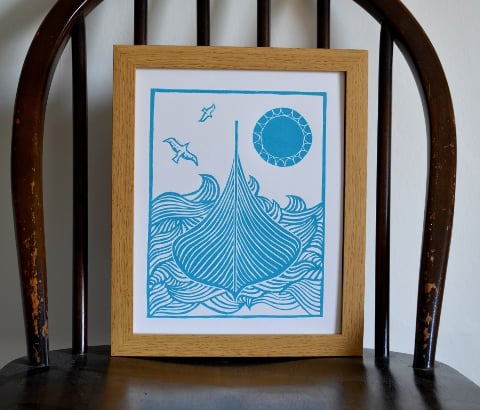 Coming back from a holiday in Iceland this summer, I came across a photo of this beaufiful viking ship in Oslo museum. I just imagined how this magnificient ship would have looked on the ocean in its hey day. I included a Scandi style sun in the design, the result is, I think, something from the books of Tolkien.