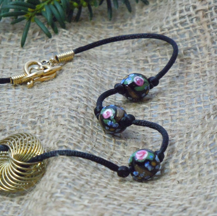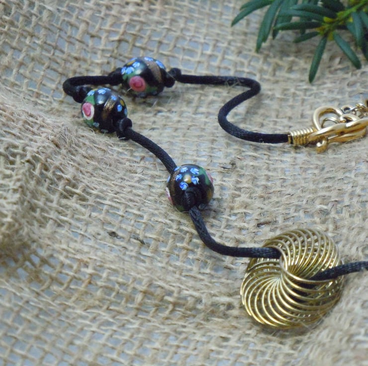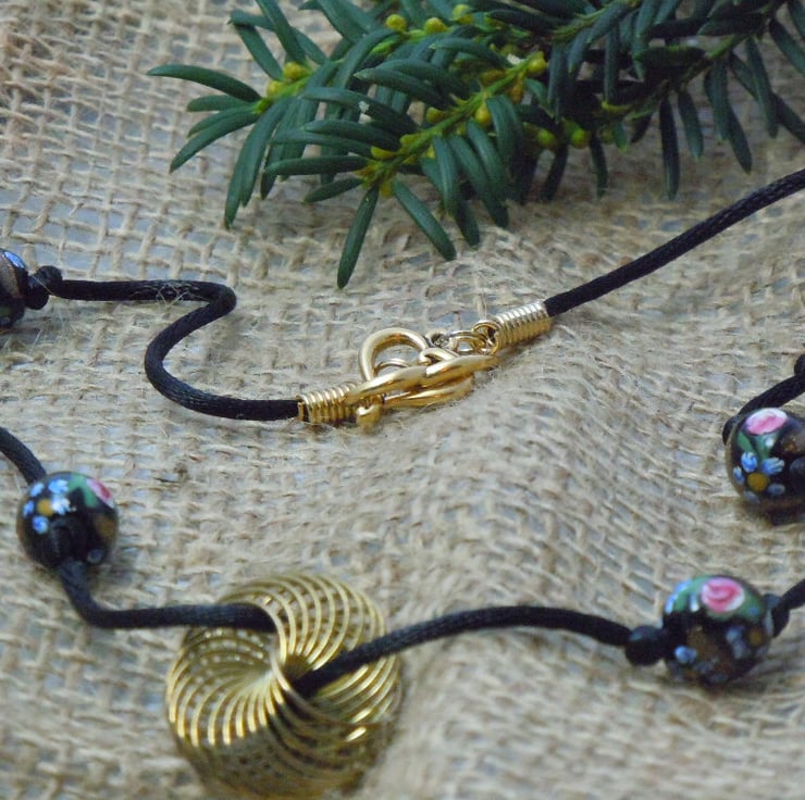 Black lampwork artisan beads with flower design & splashes of glittering goldstone glass strung on black silky cord with an antique gold plate spiral wire focal bead & finished with a TierraCast gold plated heart toggle clasp. A matching bracelet is available.