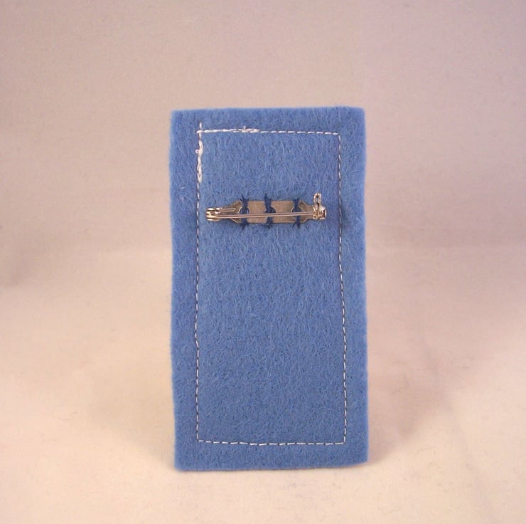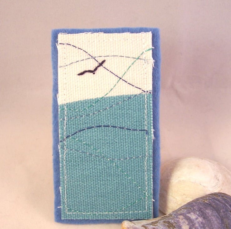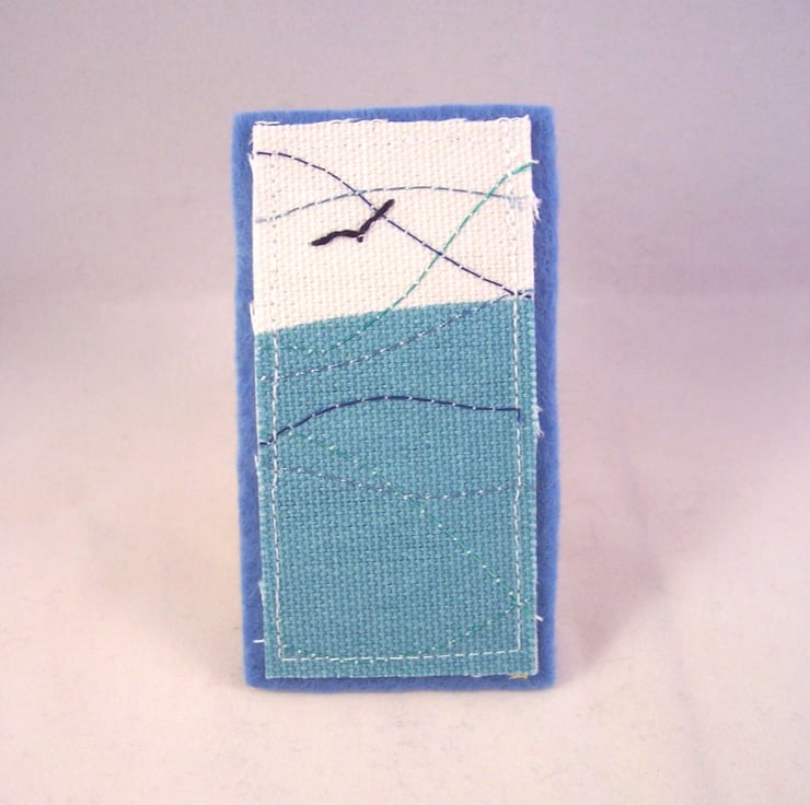 Textile brooch in cool watery shades. White, blue, deep ade and navy thread paint the ocean and one if its wanderers.