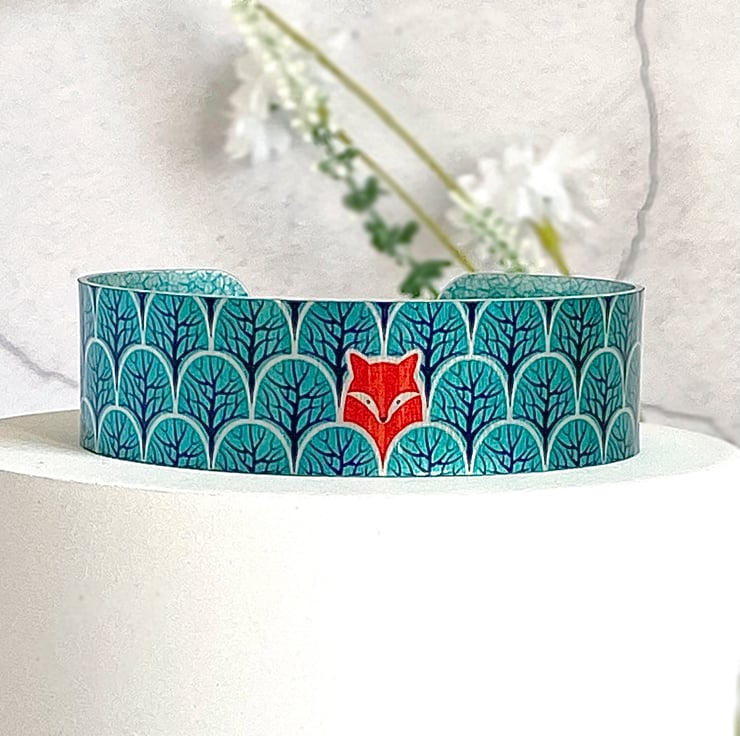 I've handmade this cuff bracelet with a hiding fox in the woodland. The trees are a teal colour with a cute fox popping his head out. This would make an ideal gift for a wildlife or fox lover. In addition it can be engraved on the reverse with a personal message for a small extra fee (Optional).