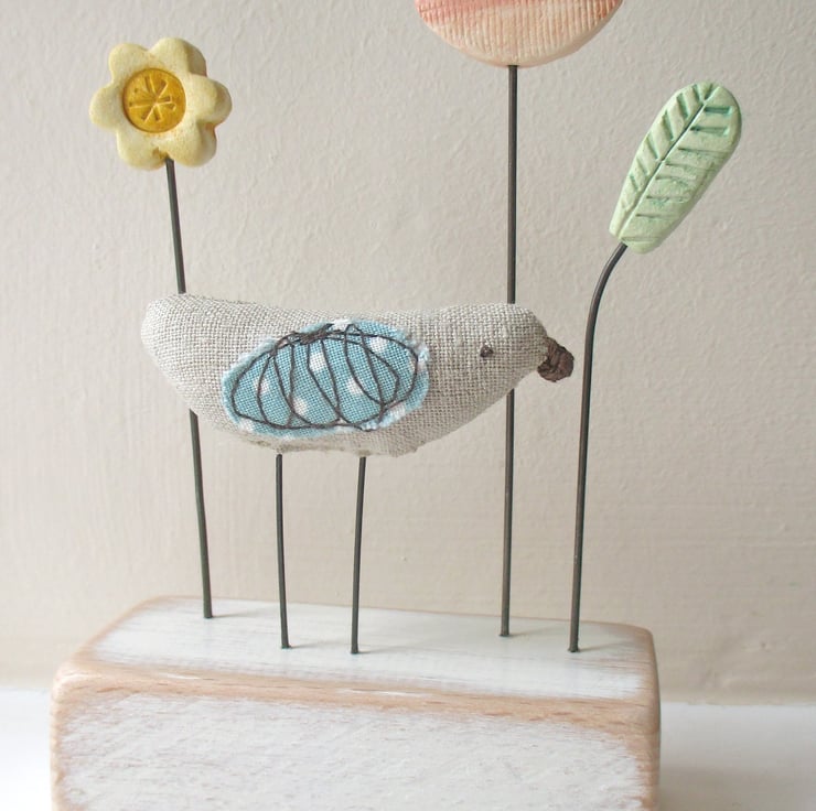 This hand stitched little linen bird has a wing stitched from a tiny fabric scrap and two little wire legs. It is perched on a sanded, painted and waxed wood block.