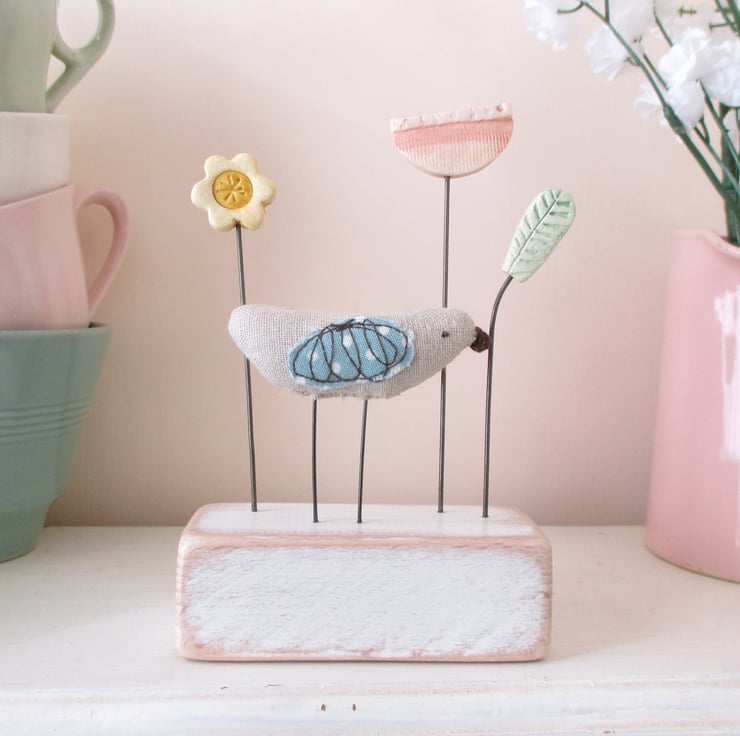 This piece is one of a kind, created from my love of making, exploring and mixing different materials to make a pretty scene that brightens any day.