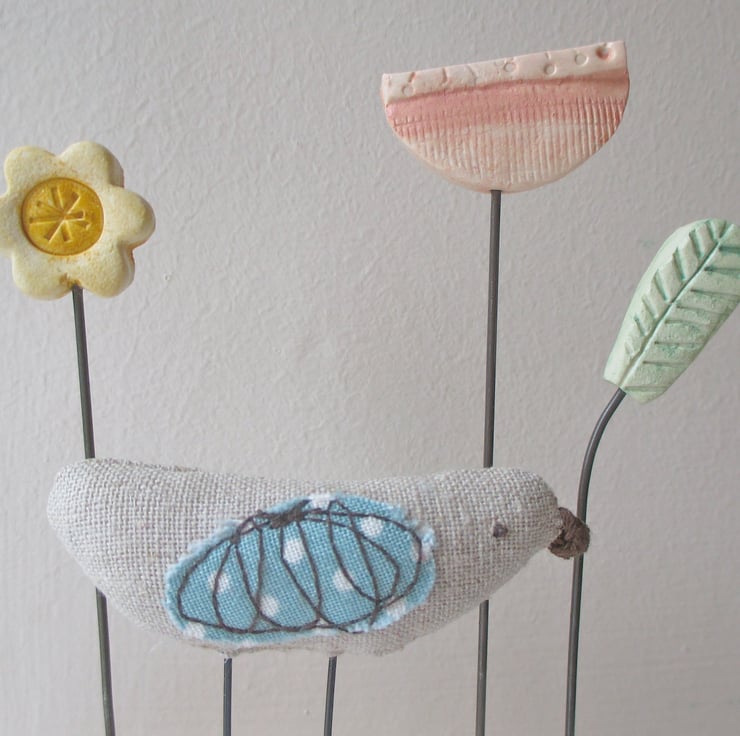 The flowers are hand moulded from oven baked clay. They have been painted and varnished and dance on their wire stalks with a clay leaf.