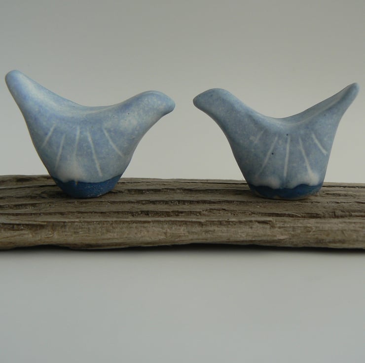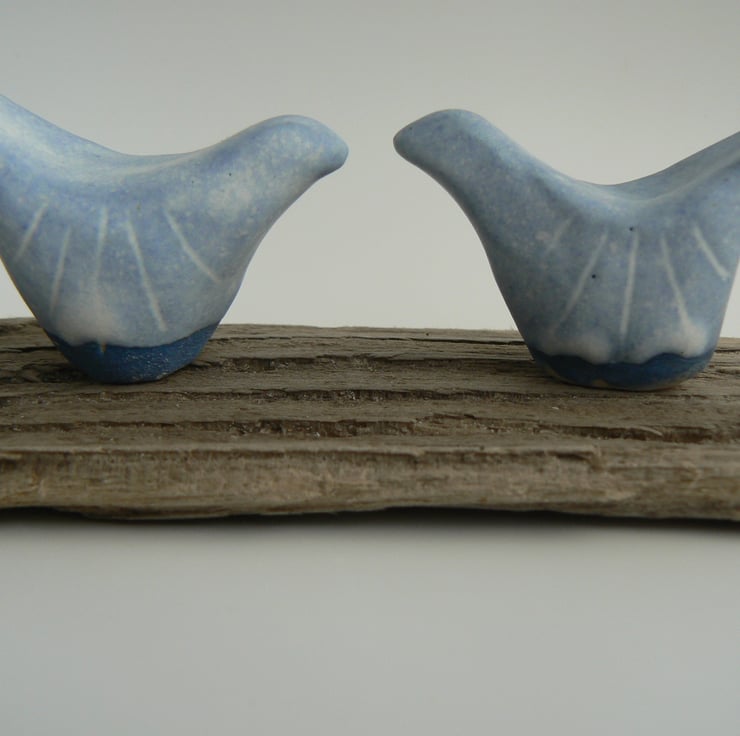 A pair of tiny ceramic birds. Using blue slip the decoration has been scratched through to the clay. Finally they are glazed with a snowy white stoneware glaze.