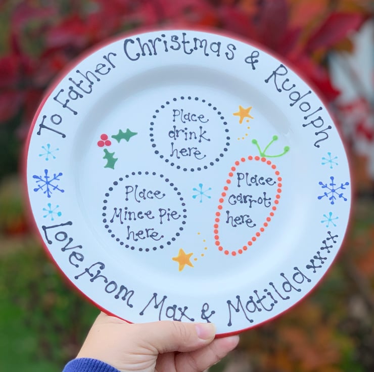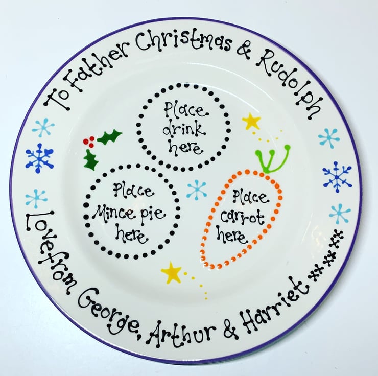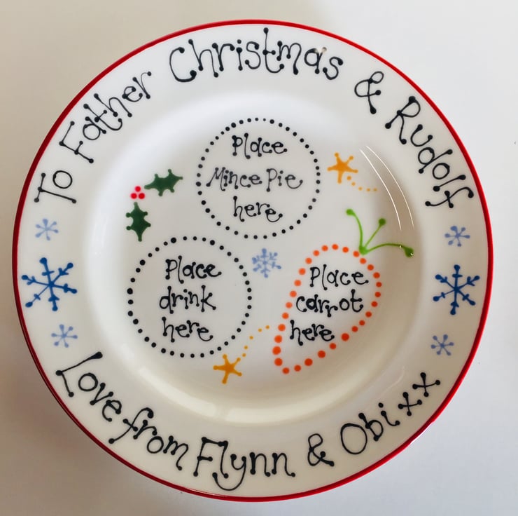 This ceramic Christmas Eve Plate has been hand painted with a perfect space for Santa's tipple and mince pie as well as Rudolf's carrot. It can be personalised on request to include children's names and is available with a red or blue rim. The plate has been glazed and kiln fired making it food and dishwasher safe. Not recommended for use in an oven or microwave.