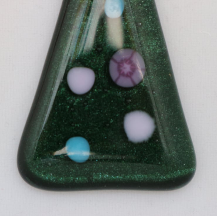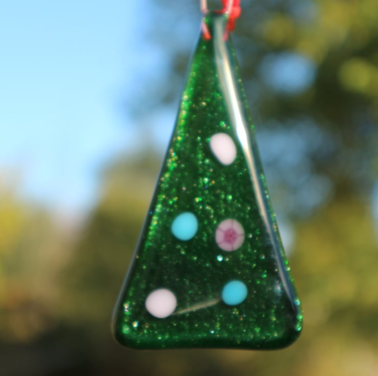 Each tree is made from sparkly green aventurine glass base and pastel pink and blue opaque decorations, including a focal millefiori dot. They are approximately 9cm high and are tied with red ribbon. They can be hung from a tree or used as a suncatcher. Sold singly.
