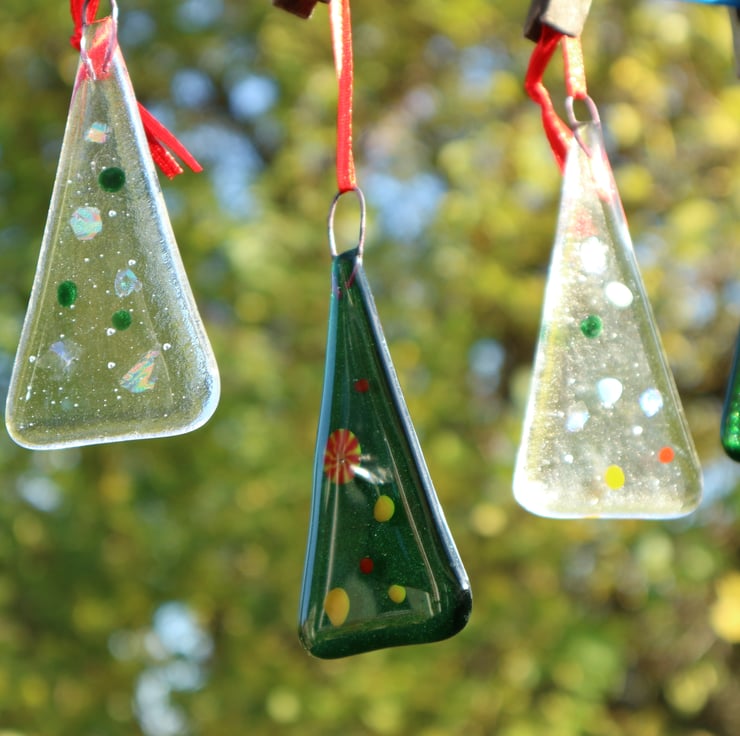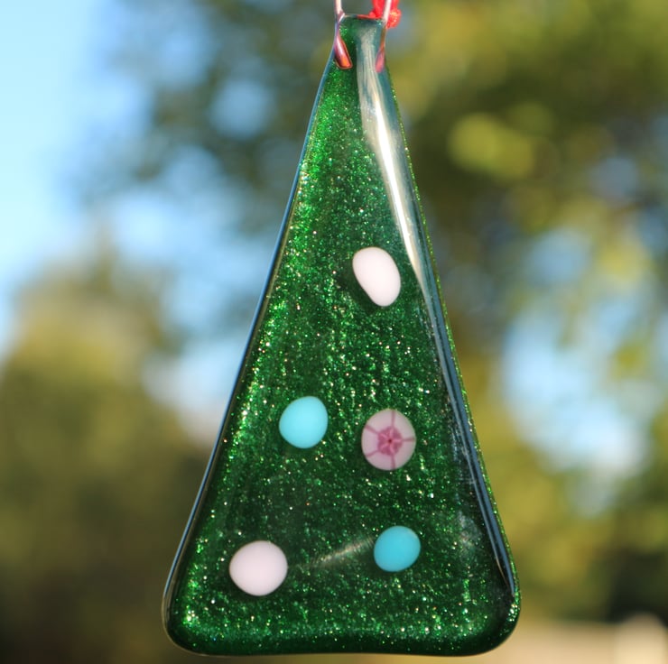 This glass Christmas tree was fused by me in my studio. The glass was heated up to around 790 degrees celsius in a small glass fusing kiln and was then brought to annealing temperature to make it strong. This whole process takes over 10 hours to complete for each tree. This would make a great gift or stocking filler or decoration for the Christmas tree.
