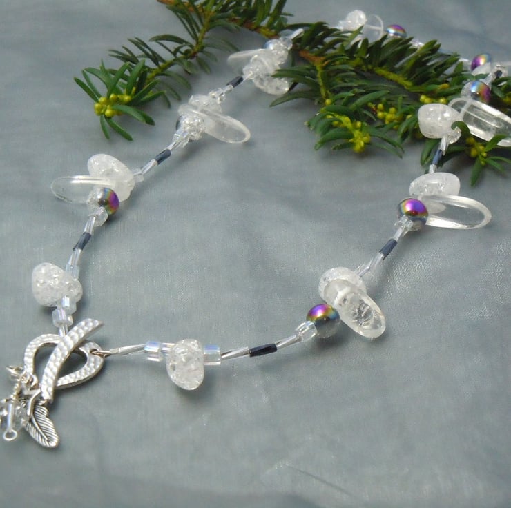 A selection of Quartz beads - clear & crackled quartz crystal with coloured highlights reflecting like Christmas tree baubles, interspersed with glass bugle & cube beads finished with a silver plate TierraCast toggle heart clasp from which hangs a silver plate TierraCast feather & star charm plus a Swarovski crystal. This stylish necklace can be worn with any outfit & would be a lovely gift for a boho friend or loved one. There is a similar bracelet available. Clear Quartz is a birthstone for April.