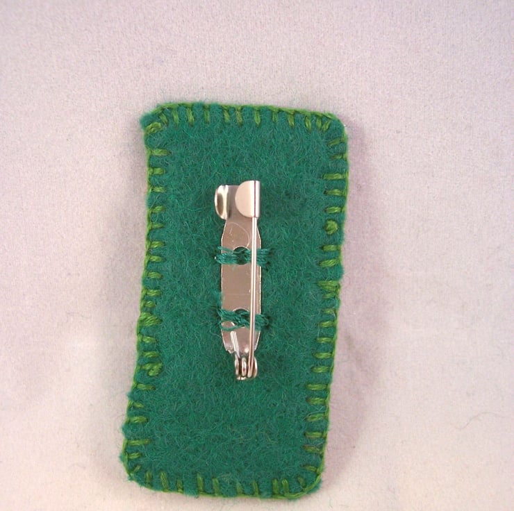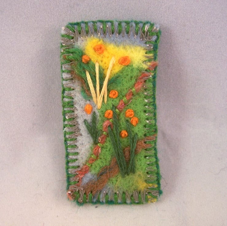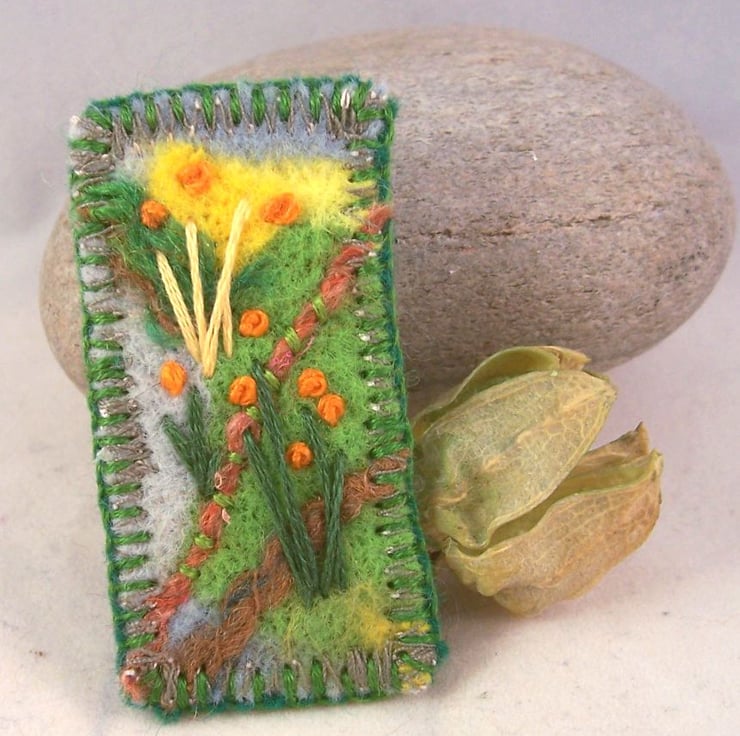 Needle felted and hand embroidered brooch, backed with wool felt.