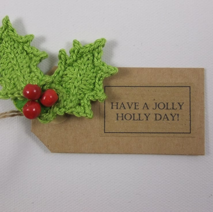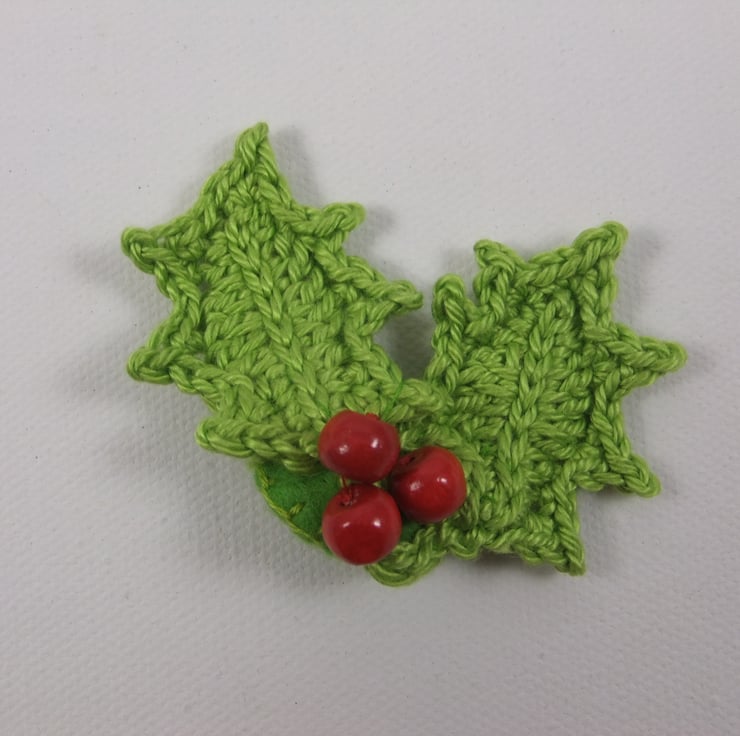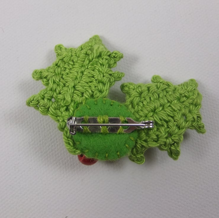 A greeting and gift in one and a great alternative to a Christmas card! This holly brooch is crocheted in cotton from a pattern by Lucy at attic24. It has shiny wooden beads for berries and the back is finished off with 3 layers of felt for strength. It measures approximately 5.5 cm at the widest point. The brooch is attached to a tag which reads, ‘Have a jolly holly day!’ It comes wrapped in tissue in a labelled PIP (Postage in Proportion) box, ready to be given or posted in style.