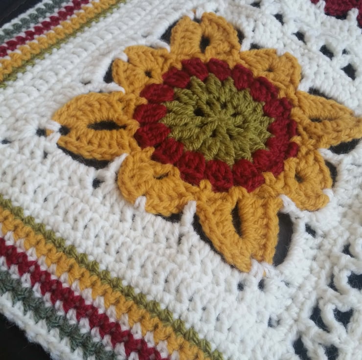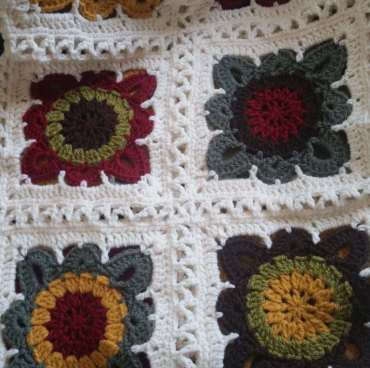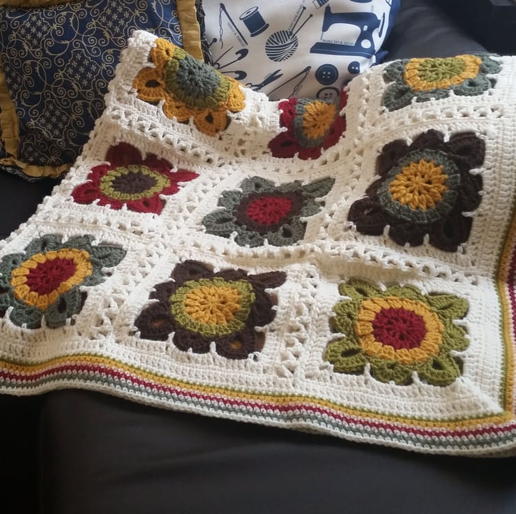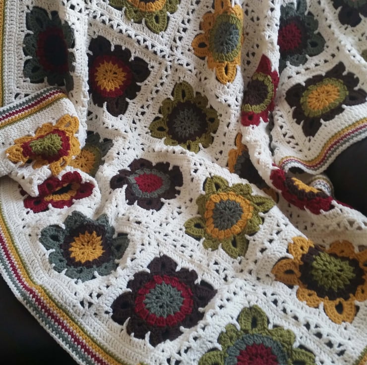 This is a lovely warm throw covered in autumnal hued flowers surrounded by cream. Green, gold, red and brown flowers stand out on the cream Aran weight yarn, making for a cosy and colourful blanket.