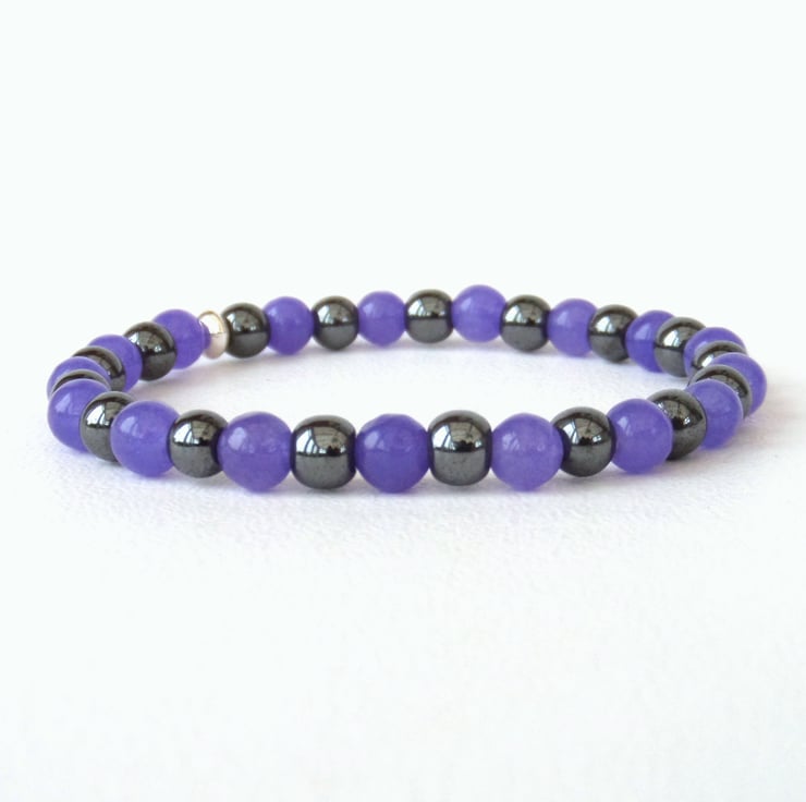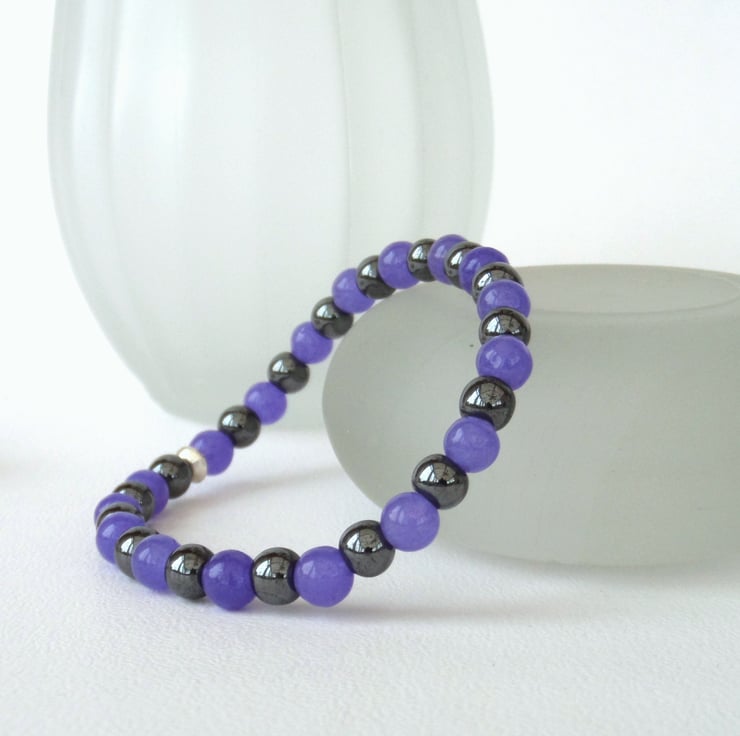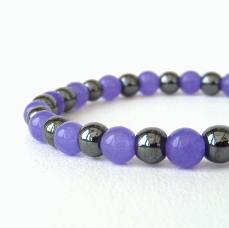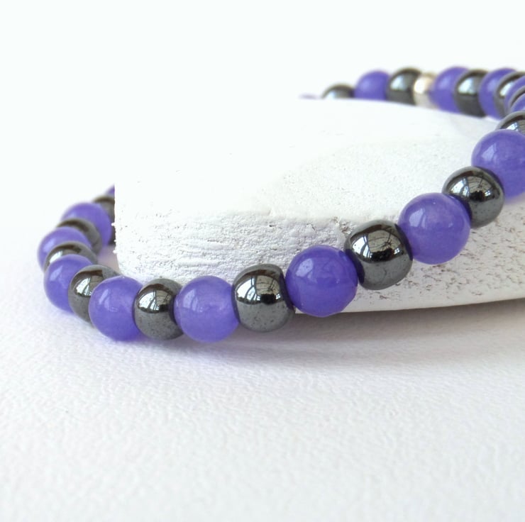 The jade is dyed in a lovely lavender purple colour that contrasts wonderfully with polished hematite in this lovely stretchy bracelet.