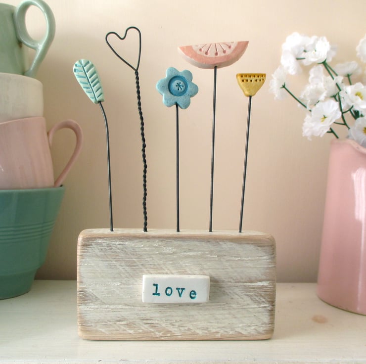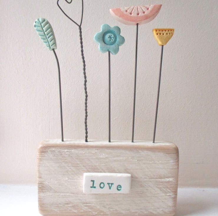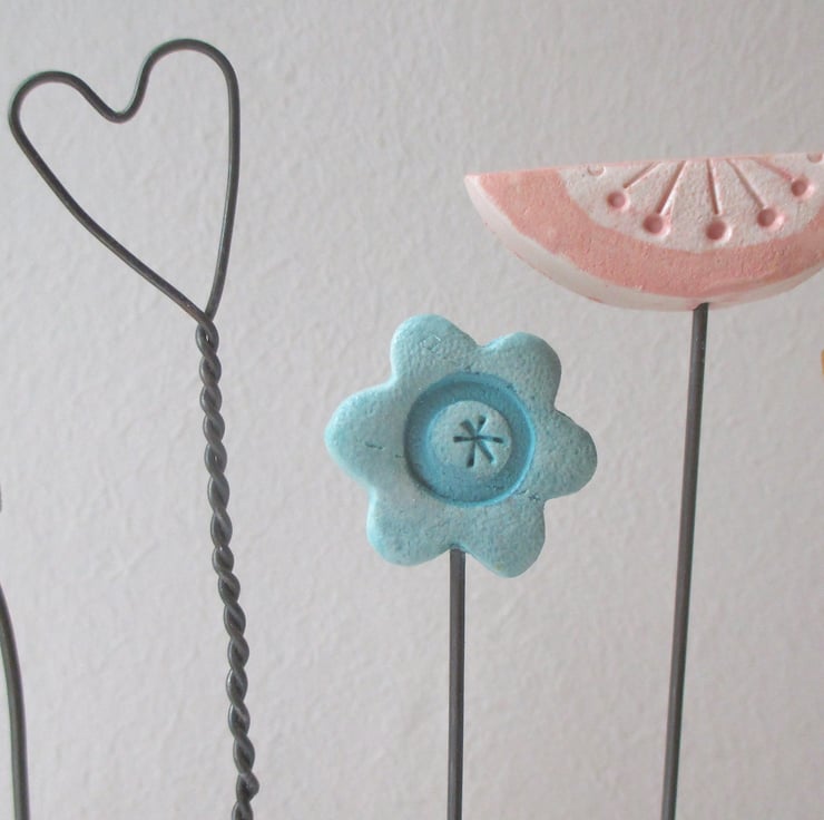 Three flowers, a leaf and a twisted wire heart make up this flower garden, standing on their wire stalks in a painted wooden block.