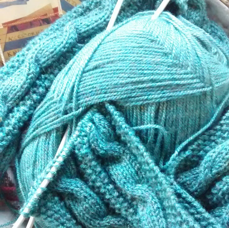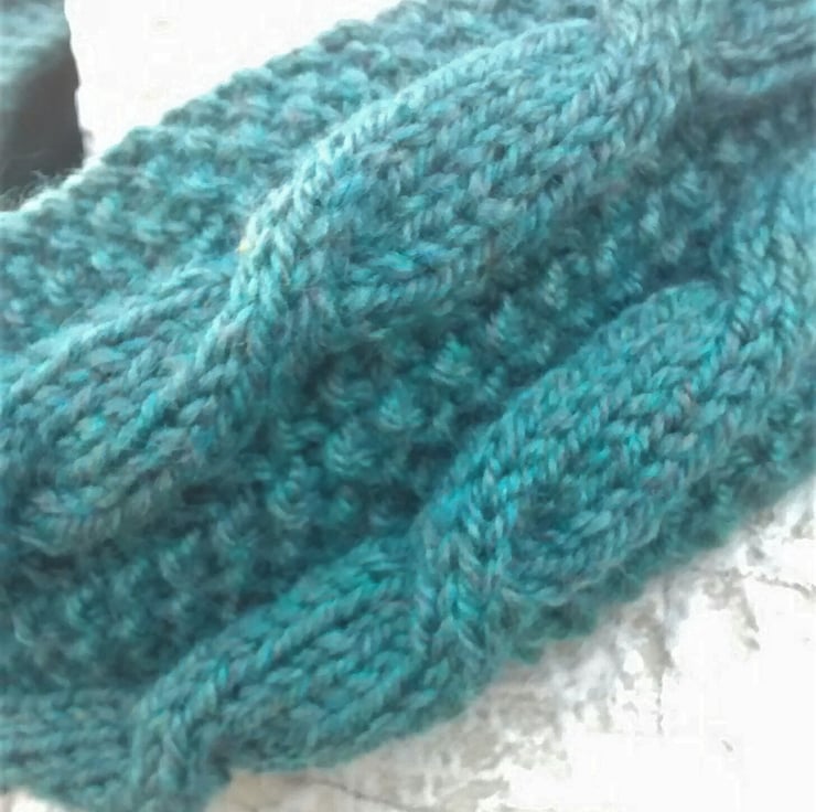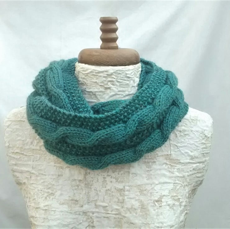 Ladies hand knit circular scarf in a wool acrylic blend and lovely cable design to add chunky texture and pattern.