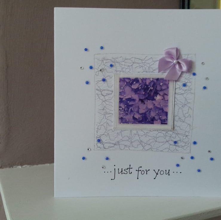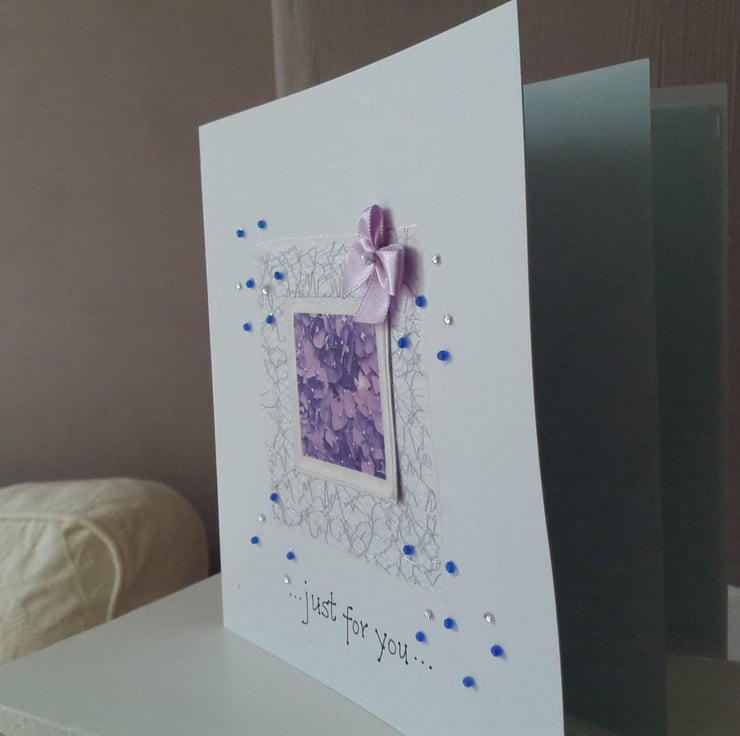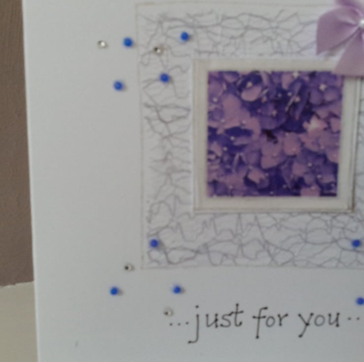 A completely handmade and uniquely designed card. Consisting of quality pristine white card which has a square of silver spiders web with a square of printed vellum mounted on it. Finished off with blue and silver crystals, lilac bow and the words 'just for you handwritten in black ink