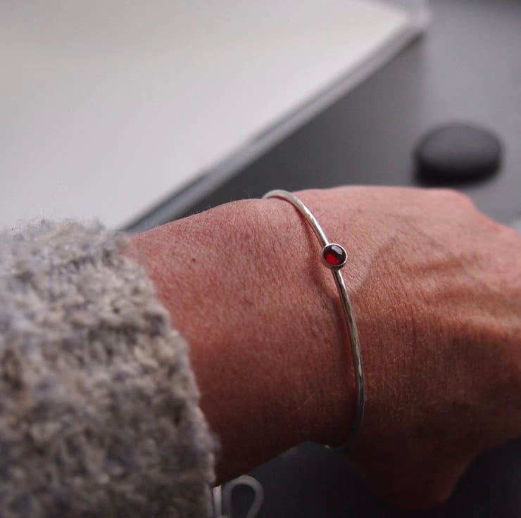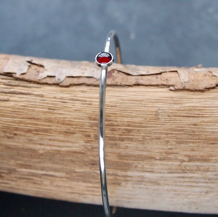 A hammered bangle made with1.8mm sterling silver with a 5mm rich red garnet cabochon.
