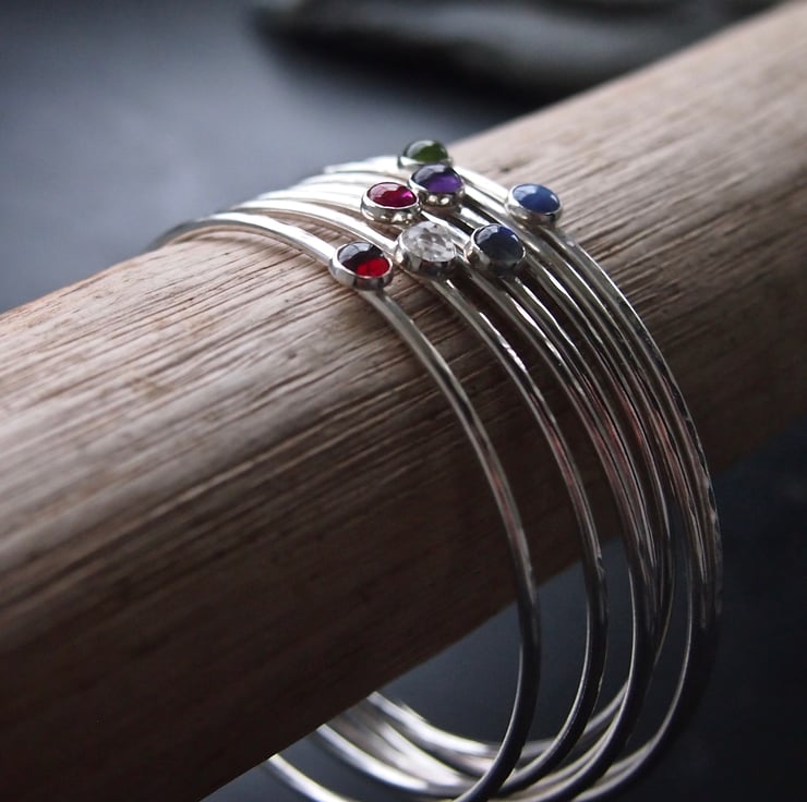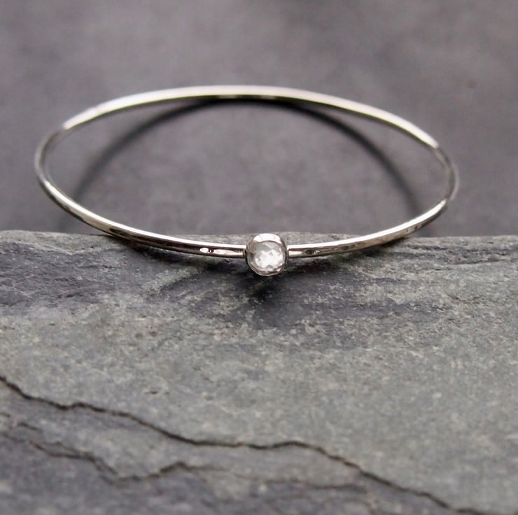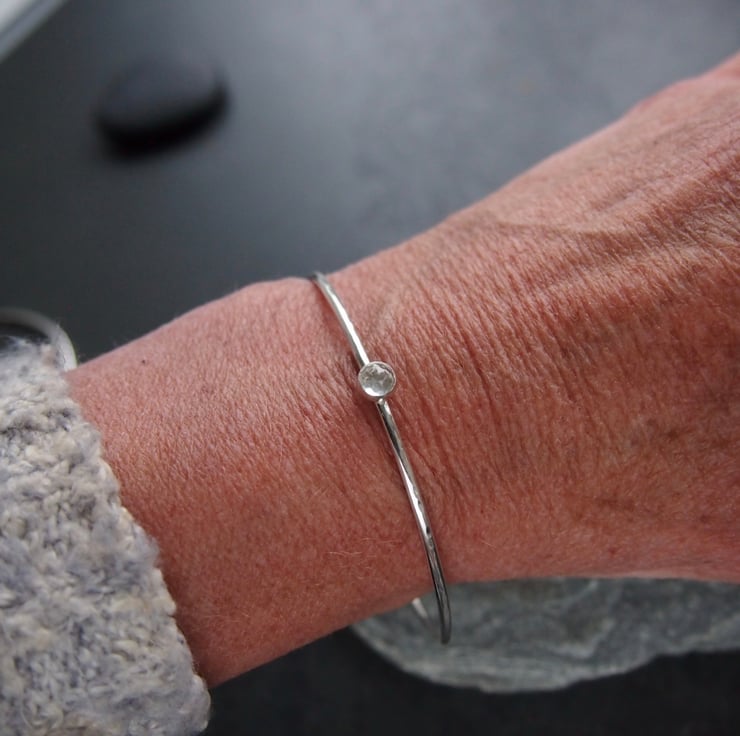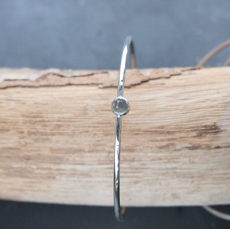 A hammered bangle made with 2mm sterling silver with a 5mm white faceted topaz cabochon. The topaz has a lovely sparkle .