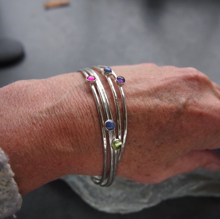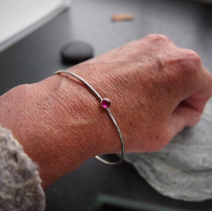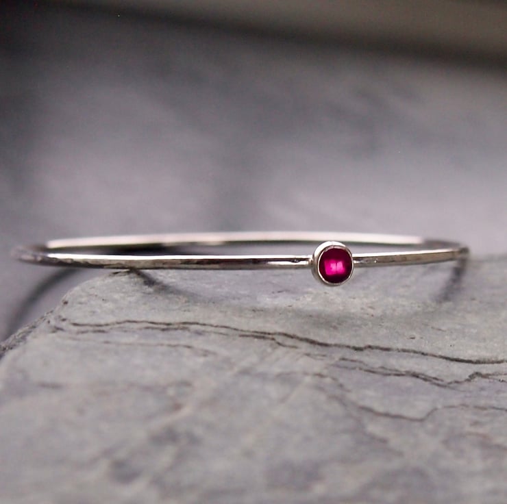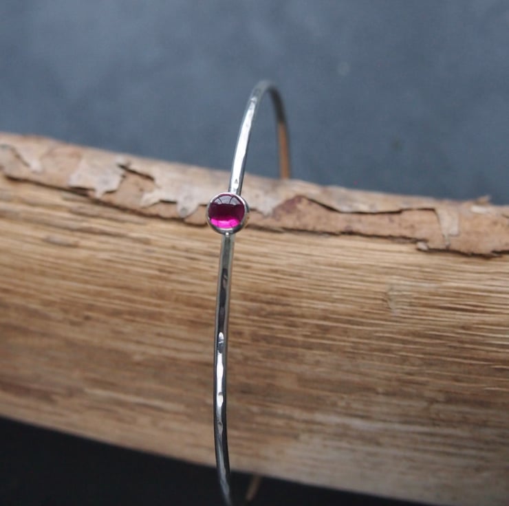 A hammered bangle made with1.8mm sterling silver with a 5mm pink ruby cabochon. This ruby is synthetic material but similar chemically and structurally similar to natural ruby.