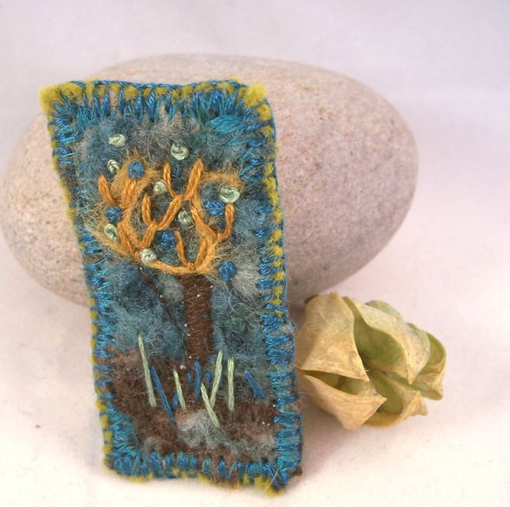 Needle felted and hand embroidered brooch, backed with wool felt.