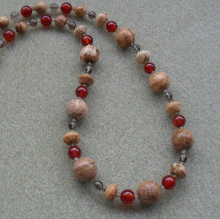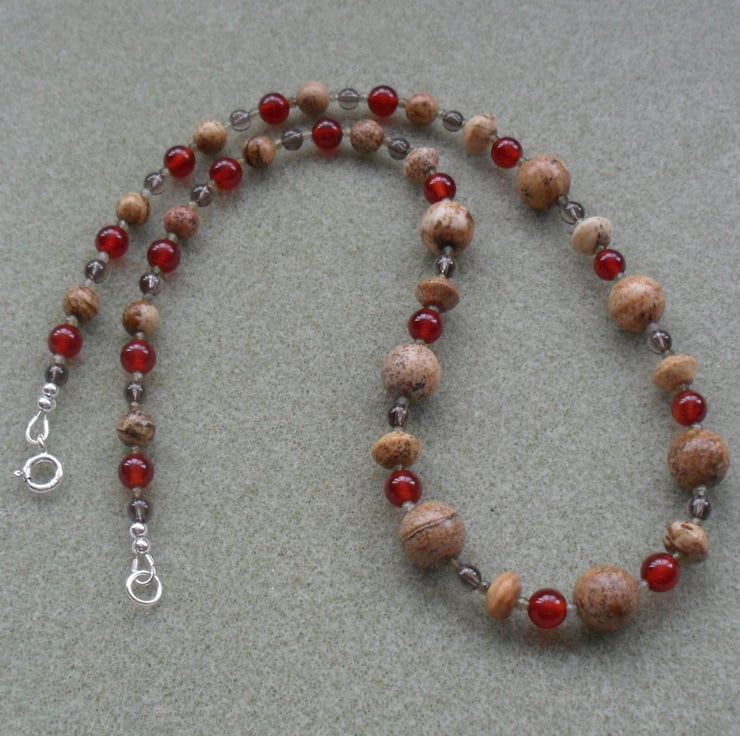 Semi precious gemstones of agate, smoky quartz,picture jasper and tiny 2 mm labradorite beads are beaded onto beading wire and attached to a sterling silver bolt ring clasp, 4 sterling silver beads and wire guardians.