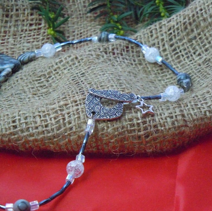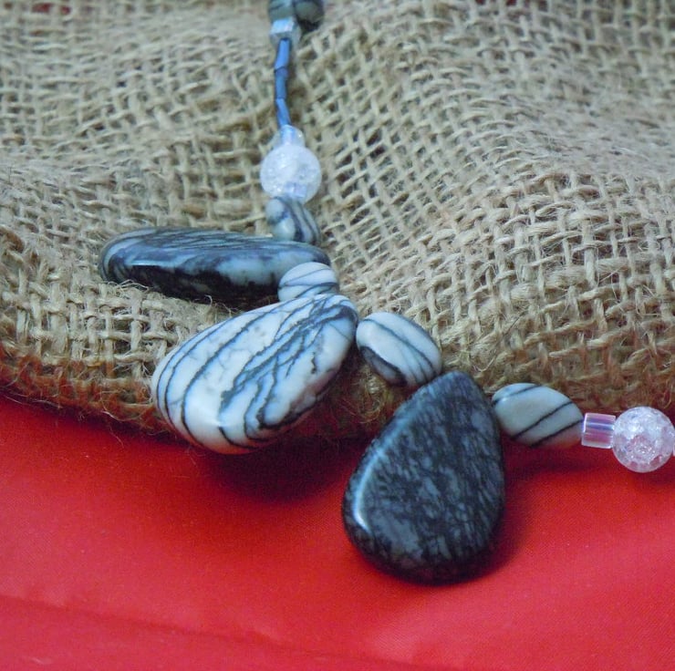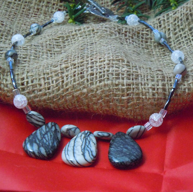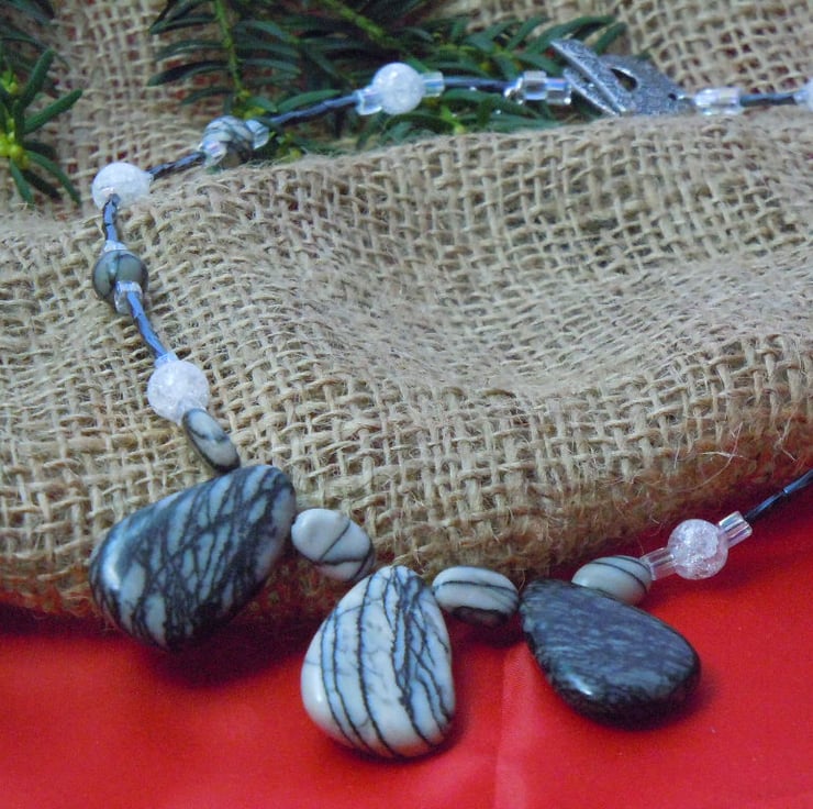 A statement & stylish necklace with spider web Jasper beads & accented with three focal beads, also crackled glass, bugle & cube beads & finished with a TierraCast silver plate toggle clasp & star charm. A stylish gift for a boho friend or loved one.