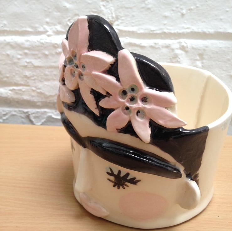 Handbuilt slab clay, hand decorated and glazed in a min toxic food safe glaze.