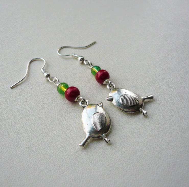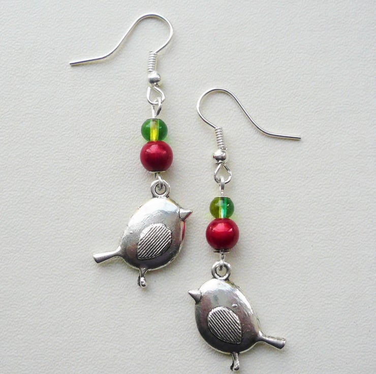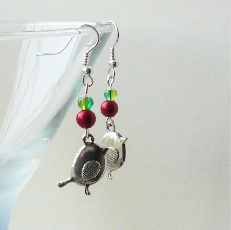 Festive Christmas robin dangle earrings made from 4mm green glass and 6mm red miracle round beads with Tibetan silver robin charms attached. All hanging from silver plated ear hooks. Total length incl hook is approx 5cm.